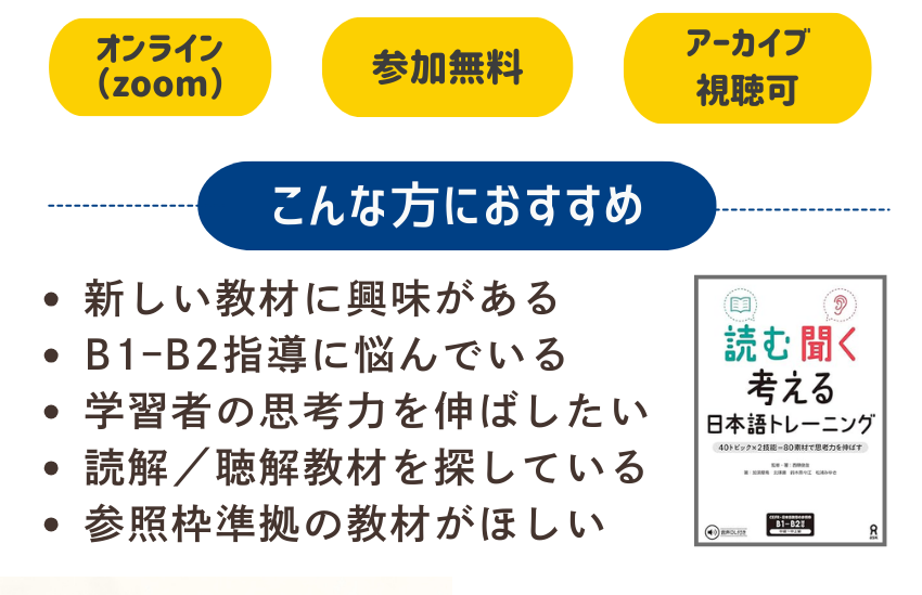 ホーム 会社情報 ニュース 1/17『読む聞く考える日本語トレーニング』活用セミナー 1/17『読む聞く考える日本語トレーニング』活用セミナー 2025.12.26 イベント お申込みはこちら! 締切:2026/1/15(木)15:00定員300名(定員に達し次第締め切らせていただきます。) 書籍の情報はこちら ニュース一覧へ戻る 会社情報 会社概要 会社沿革 事業紹介 ニュース