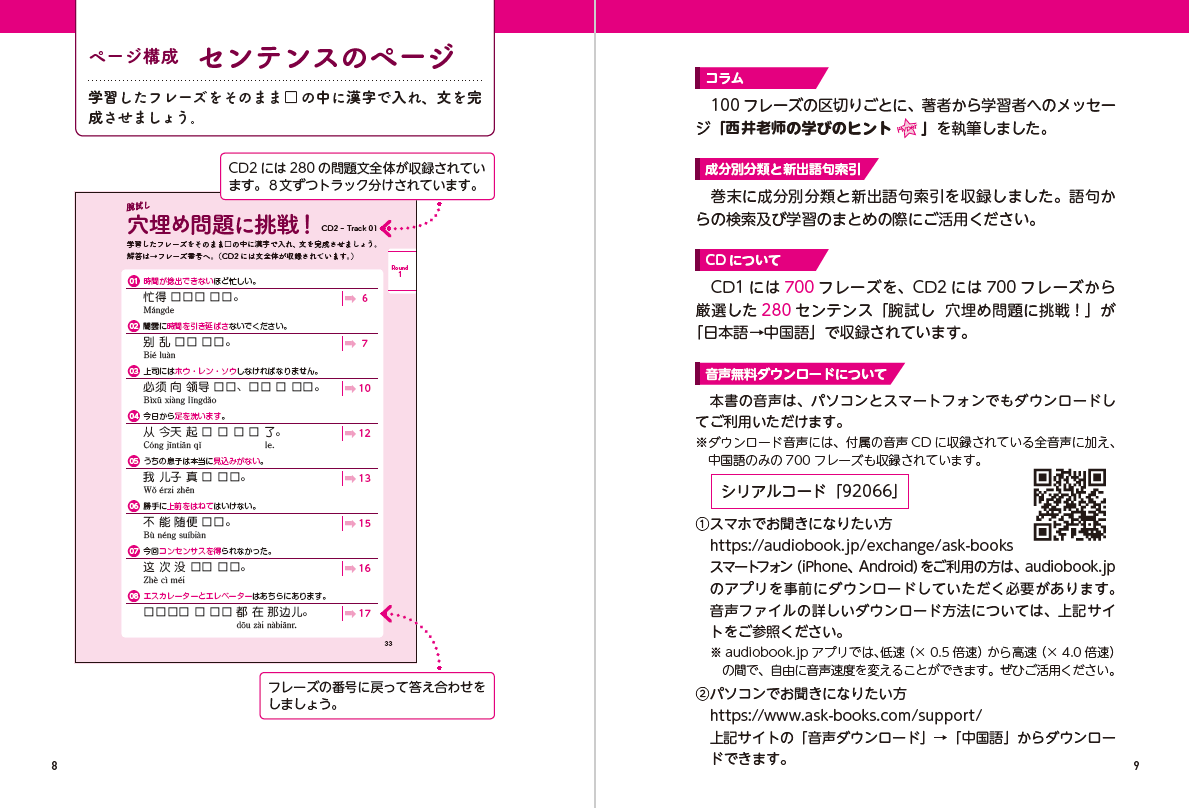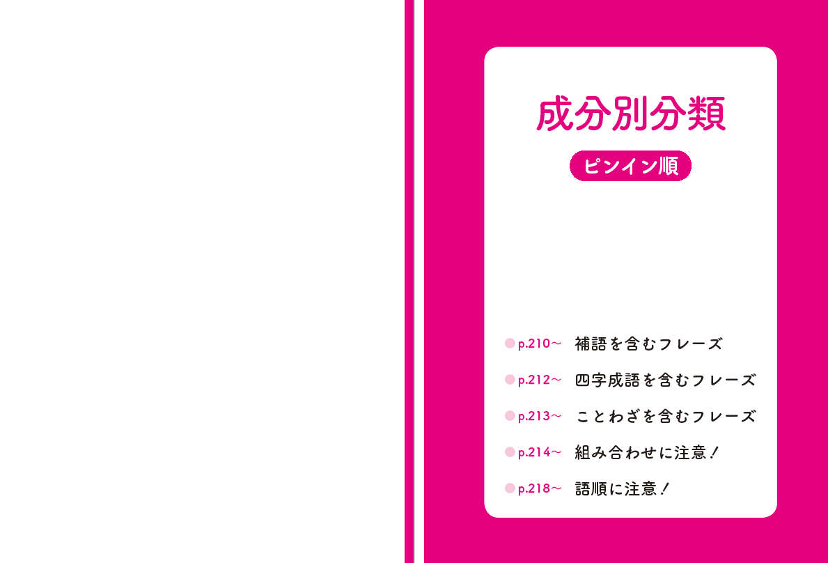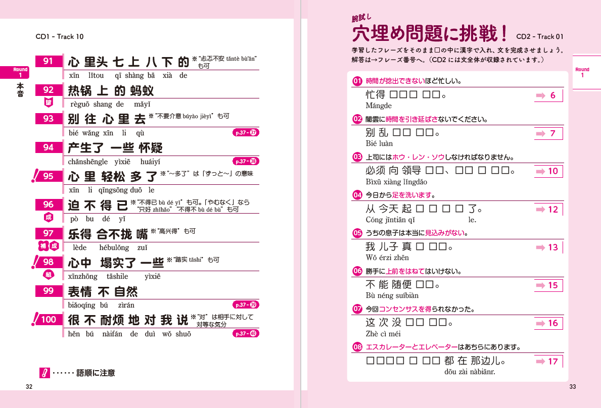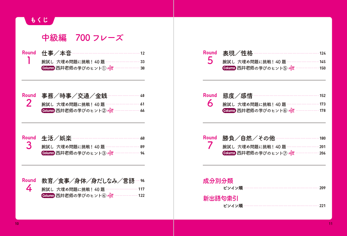 前作までの文法事項に加え、四字成語・ことわざを含んだフレーズを収録。