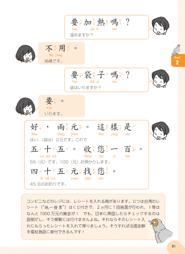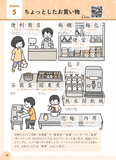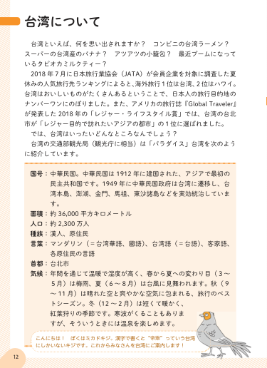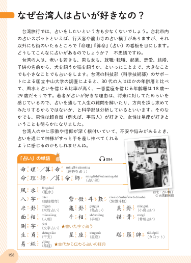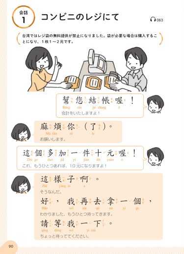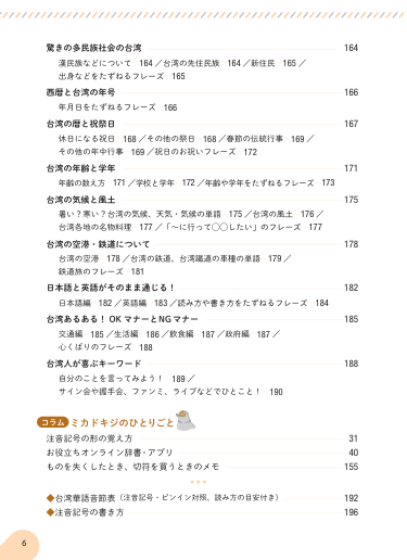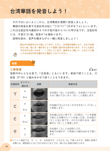 読みガナは付いていませんが、巻末の「台湾華語音節表」で目安の読み方を紹介しています。本文の文章を読む際の参考にしてください。