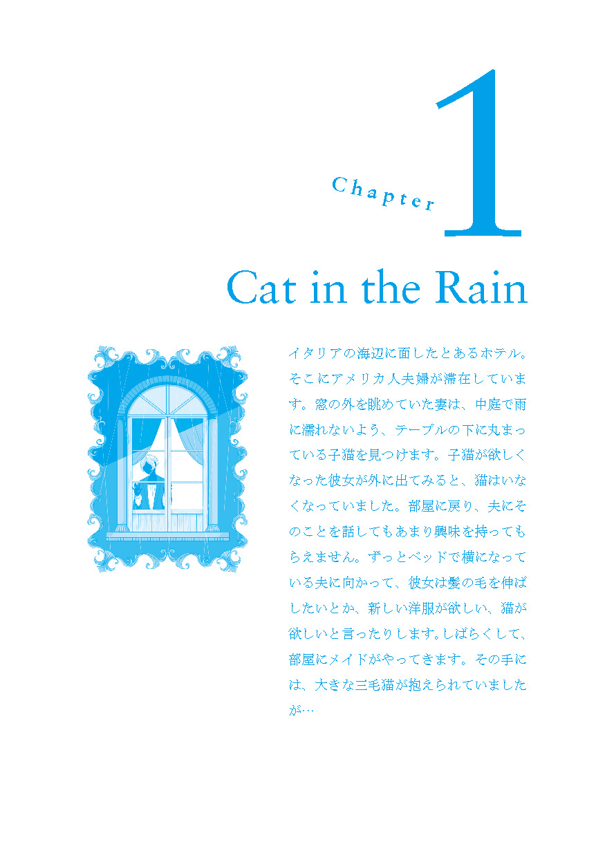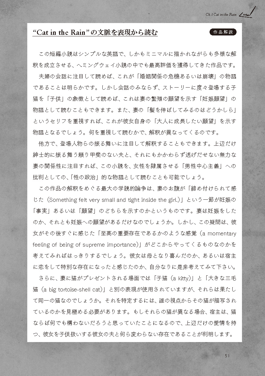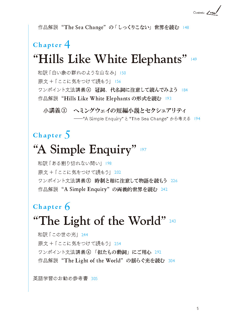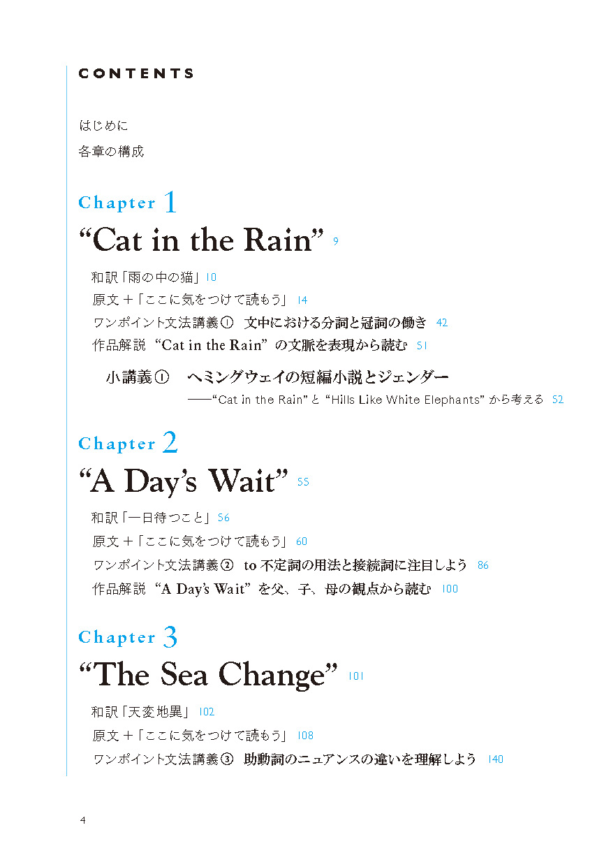 ●教科書でも採用されたことのある馴染み深い作品を中心に、無理なく通読できる長さの短編作品を6編収載(「Cat in the Rain」「Hills Like White Elephants」「The Light of the World」 「The Sea Change」「A Simple Enquiry」「A Day's Wait」)。それぞれの作品に、「冠詞と代名詞」「現在分詞と過去分詞」「動詞」「助動詞」「時制と相」「不定詞と接続詞(等位接続詞、従属接続詞)」といったテーマを設定し、「名文」を通して、「生きた英文法」を学びます。