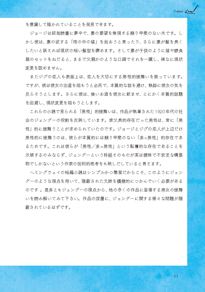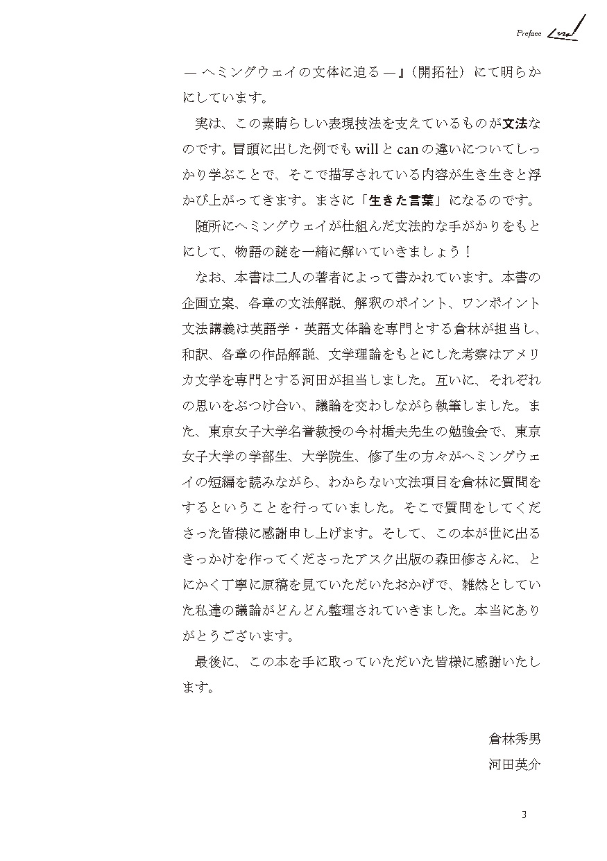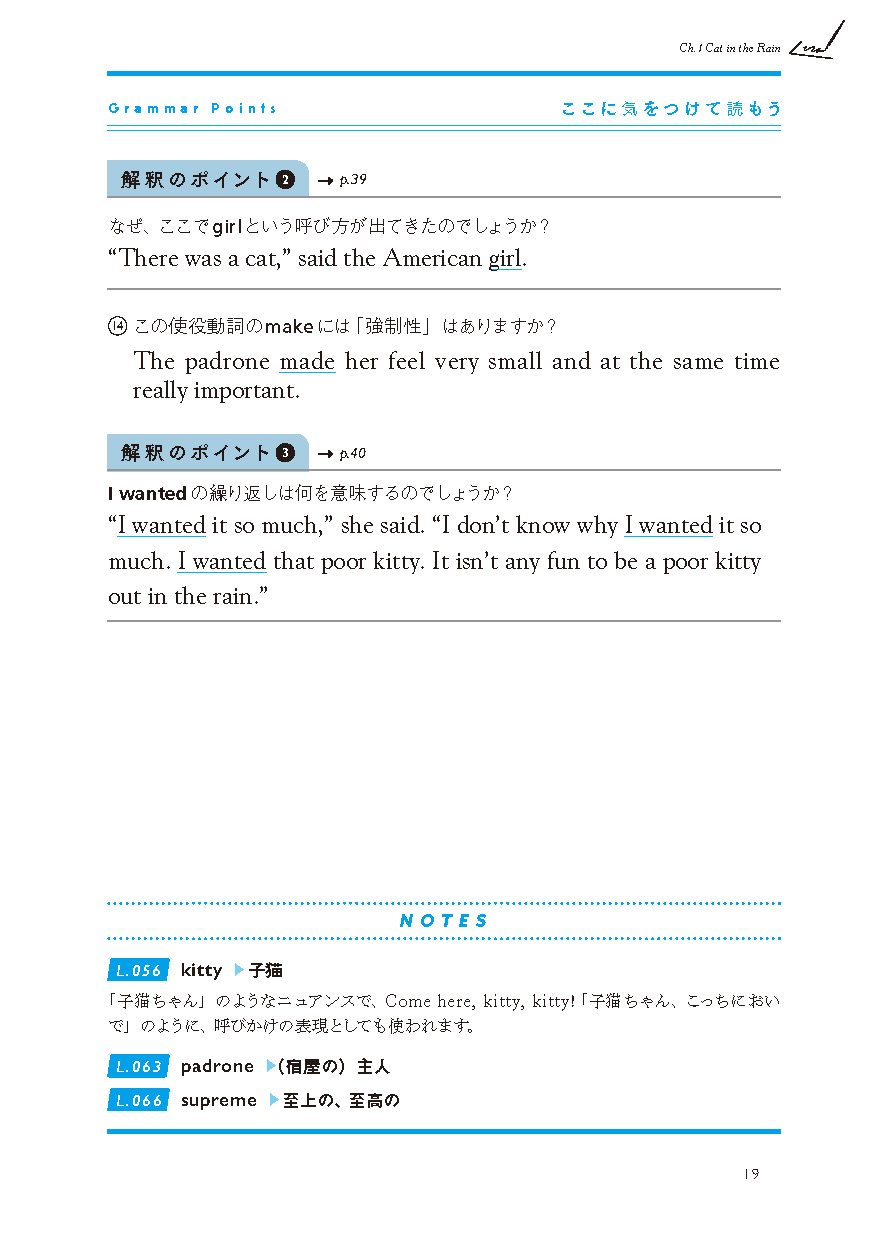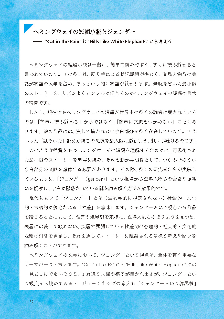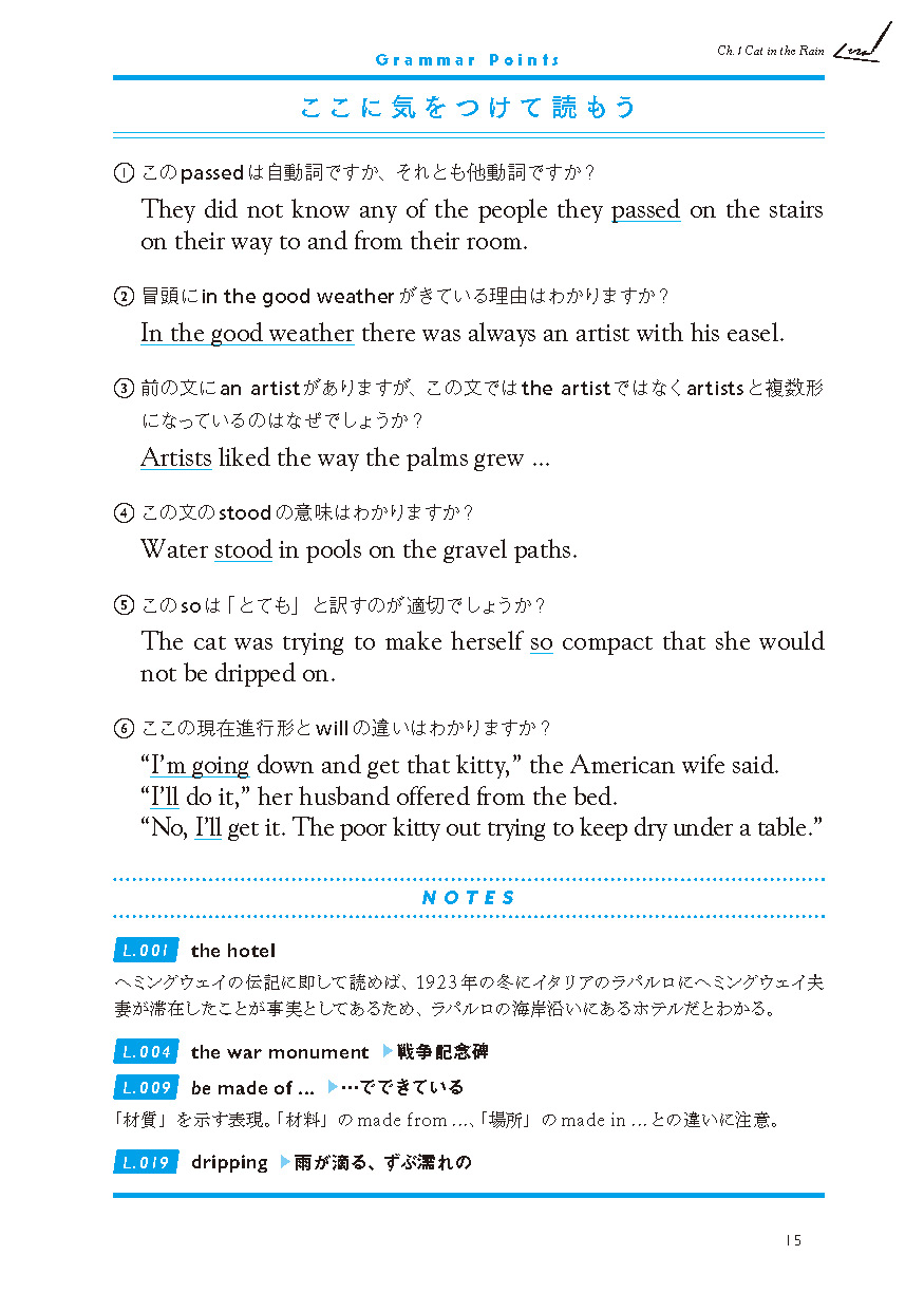 ●教科書でも採用されたことのある馴染み深い作品を中心に、無理なく通読できる長さの短編作品を6編収載(「Cat in the Rain」「Hills Like White Elephants」「The Light of the World」 「The Sea Change」「A Simple Enquiry」「A Day's Wait」)。それぞれの作品に、「冠詞と代名詞」「現在分詞と過去分詞」「動詞」「助動詞」「時制と相」「不定詞と接続詞(等位接続詞、従属接続詞)」といったテーマを設定し、「名文」を通して、「生きた英文法」を学びます。