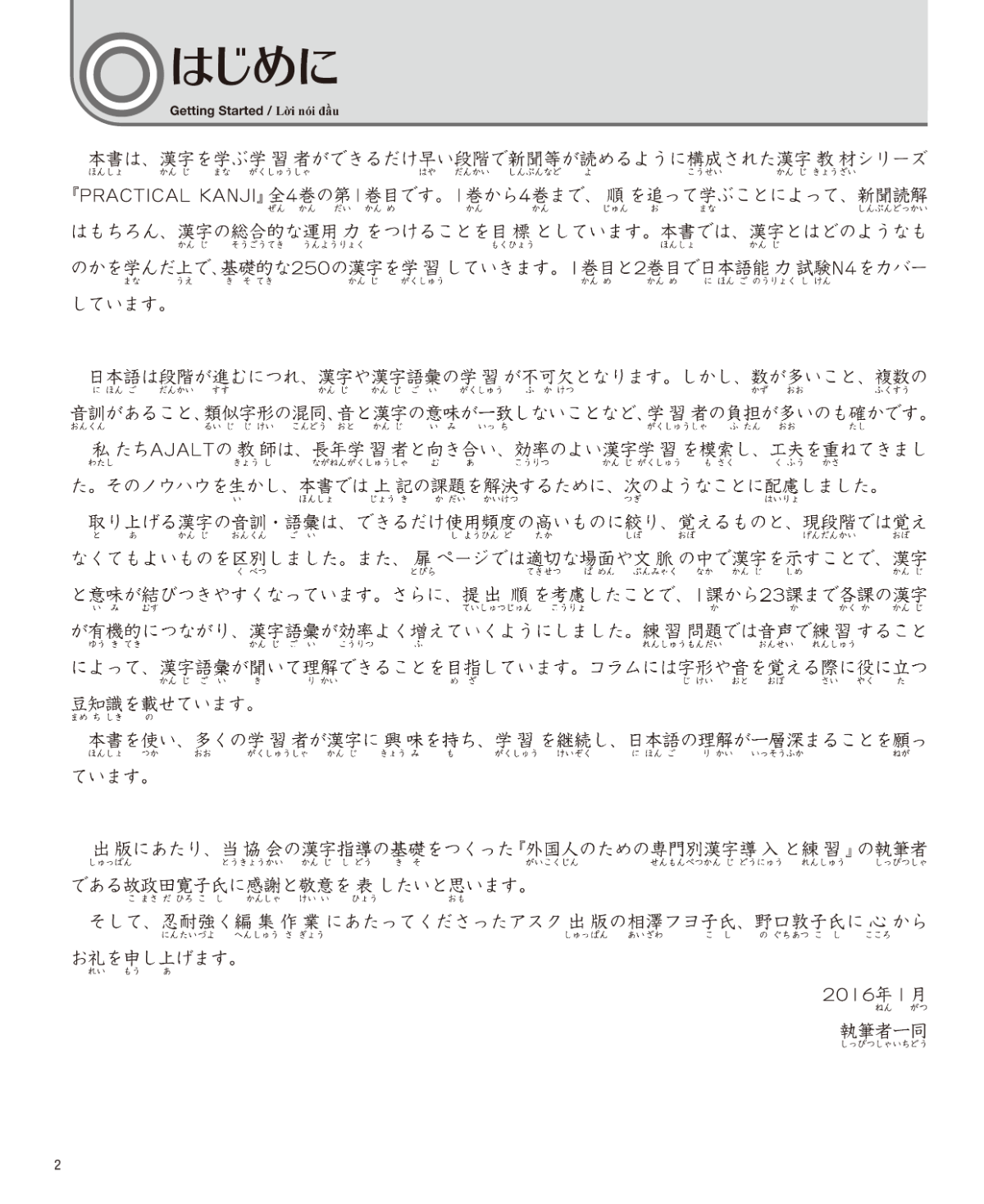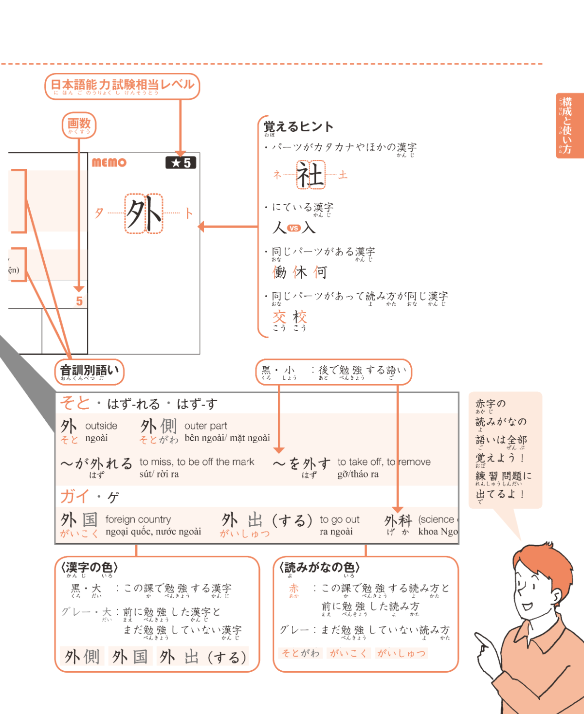 Vol.1(250字)とVol.2(250字)で基本となる500漢字が覚えられ、N5、N4レベルの漢字がカバーできる。漢字練習シート(PDF)付。