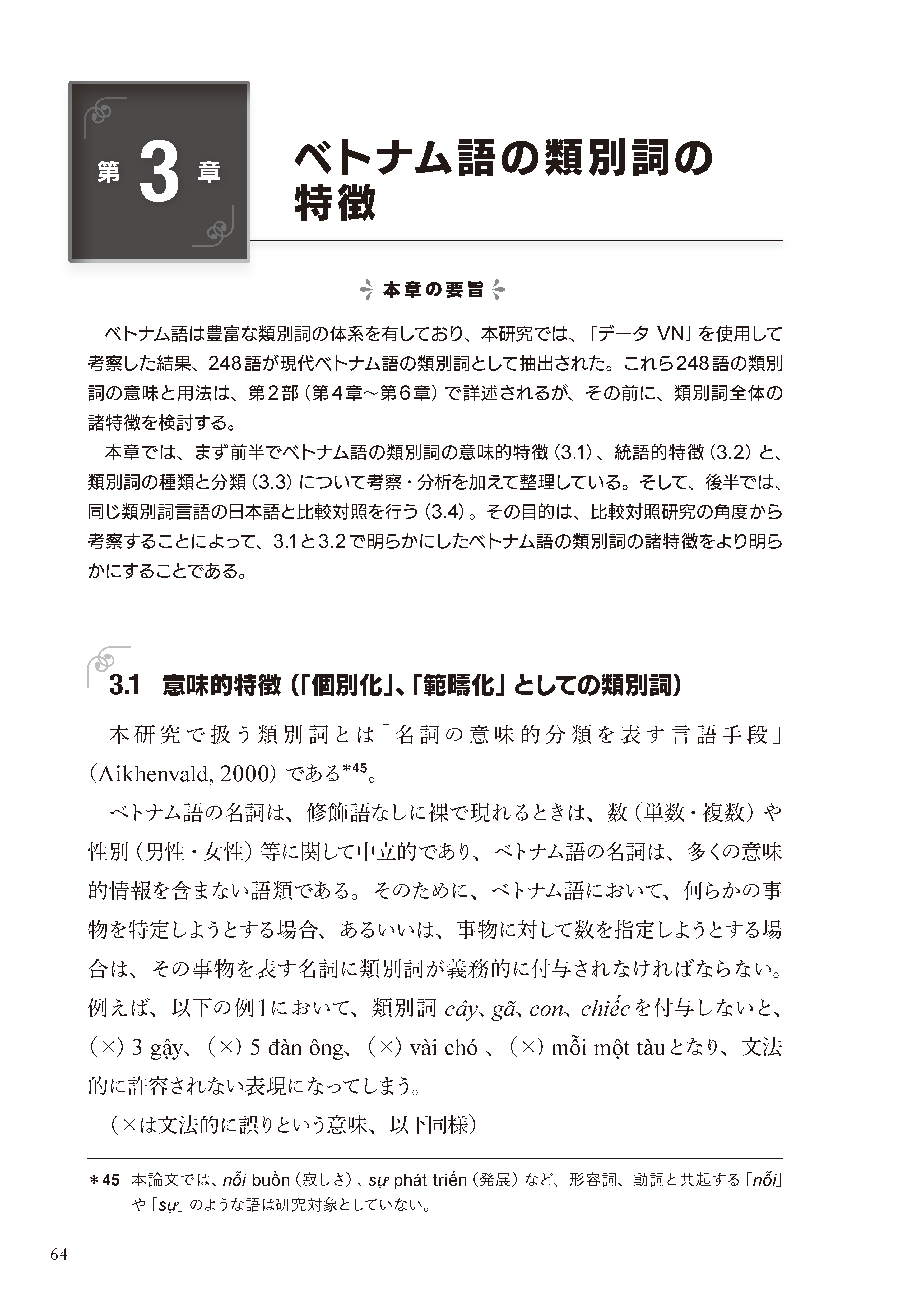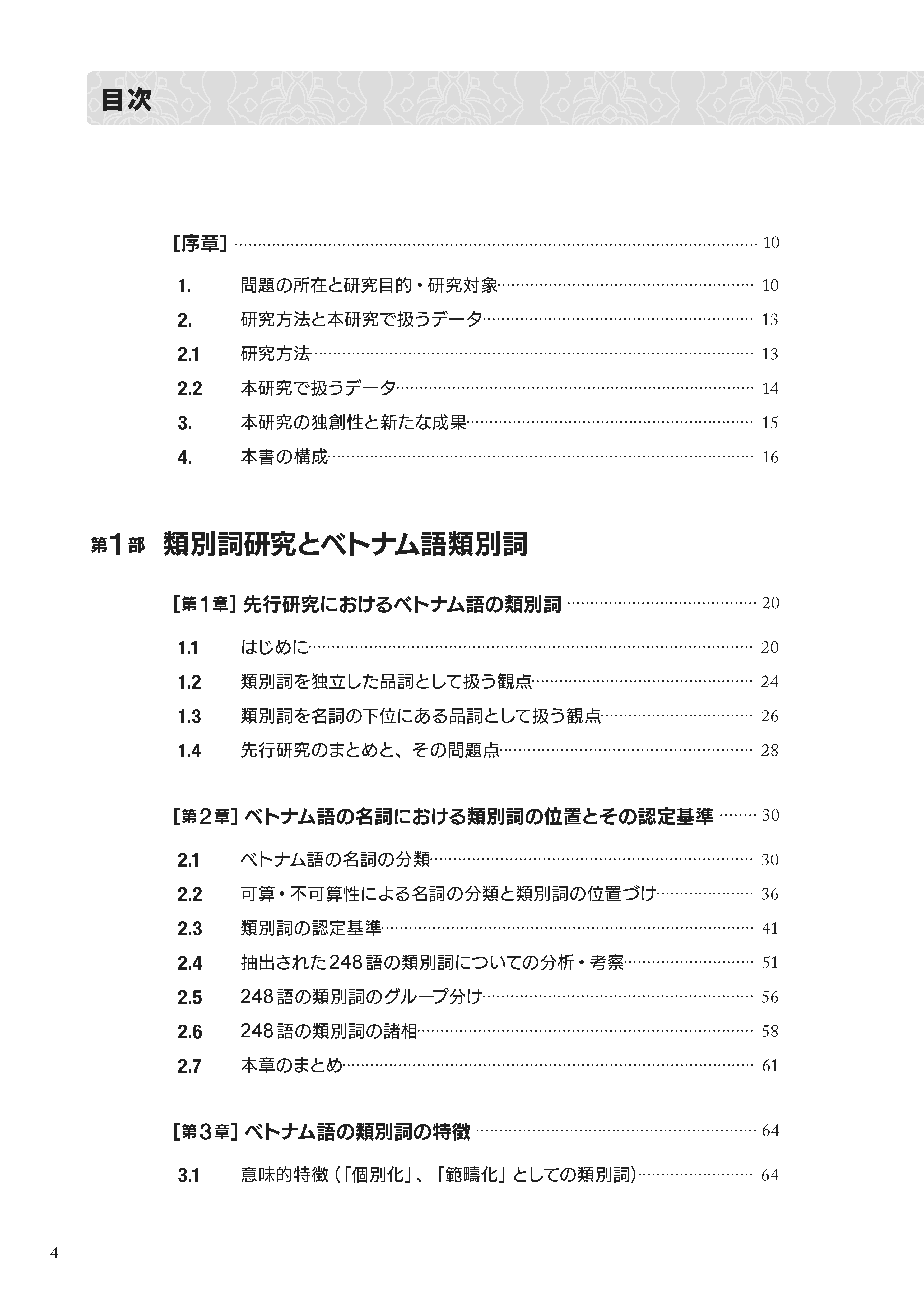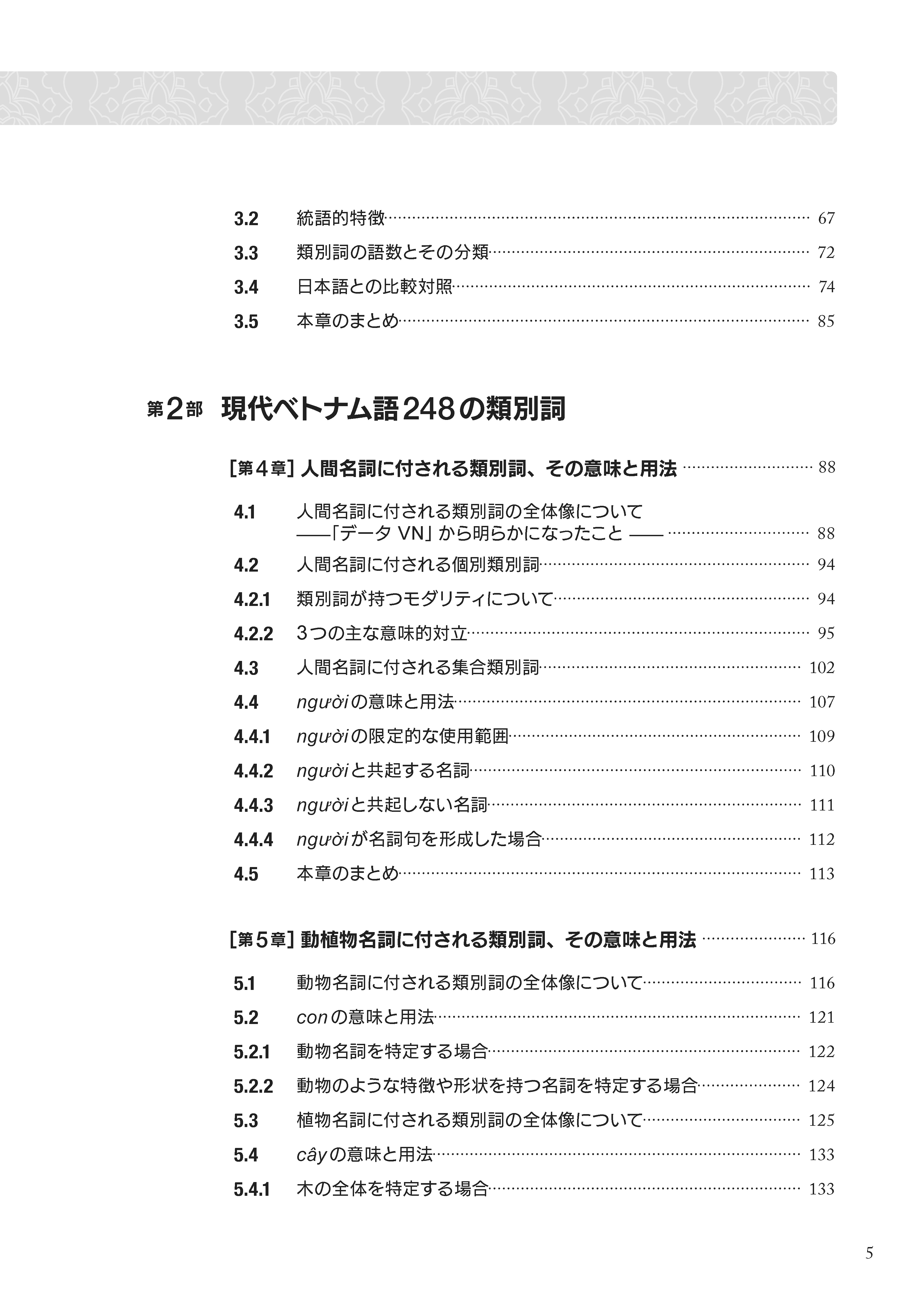 ベトナム語の類別詞は、日本語の助数詞に似ていますが、数も多く、その意味や用法を理解するのは非常に難しいとされています。本書は、筆者が一橋大学で研究を重ね、博士論文として執筆した類別詞の研究を再校正し、見やすい形に書籍化したものです。これまで断片的にしか記述されてこなかったベトナム語の類別詞の世界の全体像が明らかになりました。