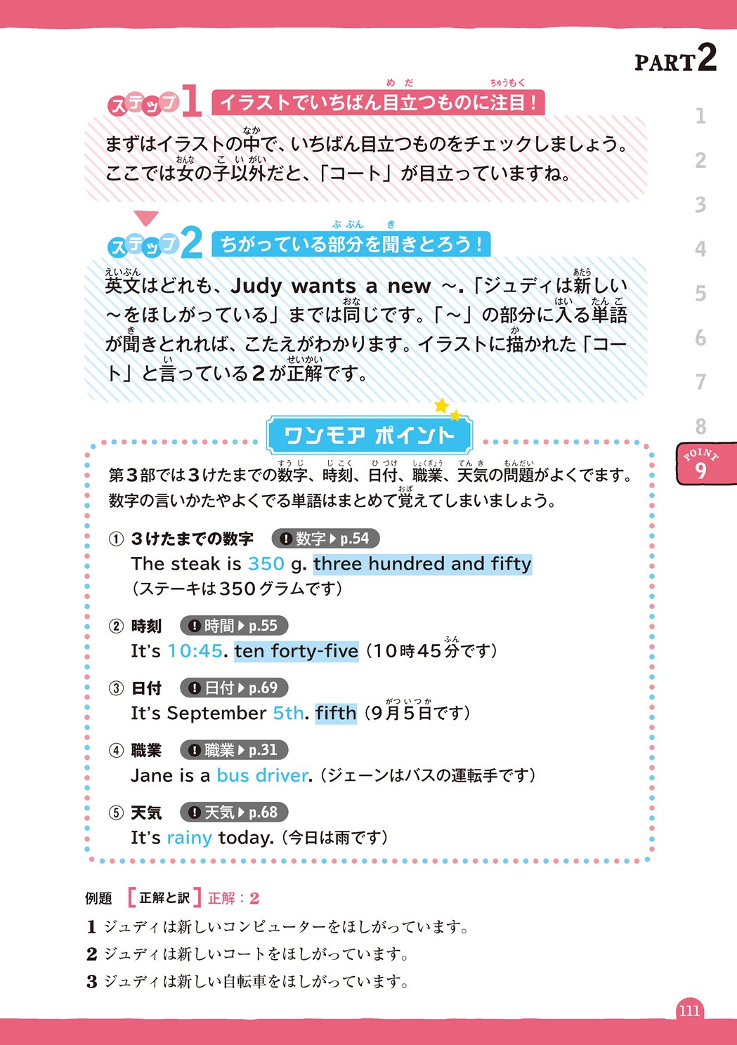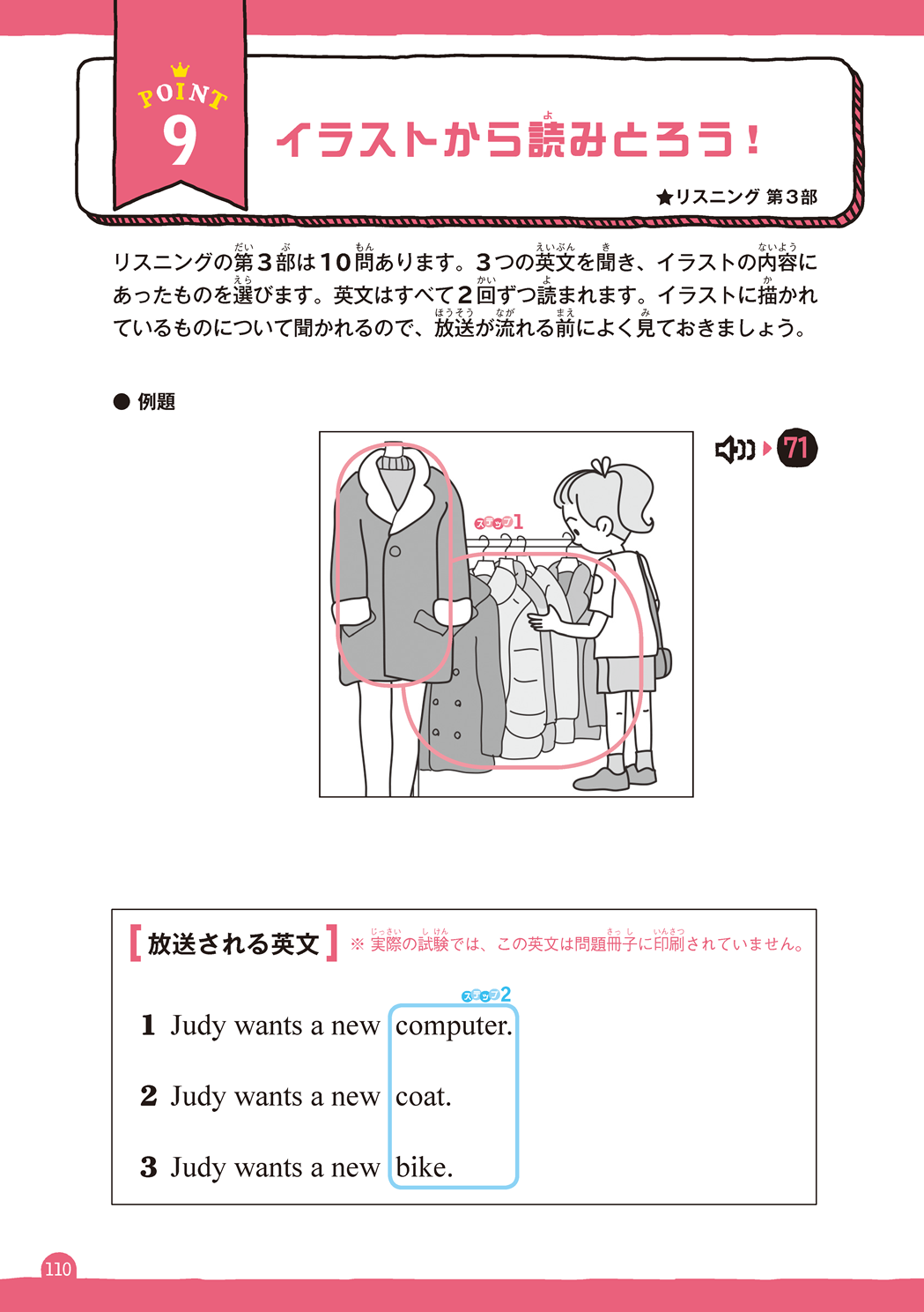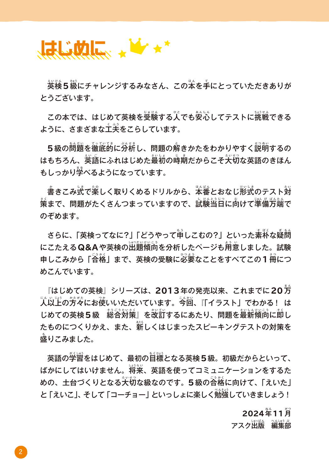 今回、『「イラスト」でわかる! はじめての英検5級総合対策』を改訂するにあたり、問題を最新傾向に即したものにつくりかえ、 また、新しくはじまったスピーキングテストの対策を盛りこみました。