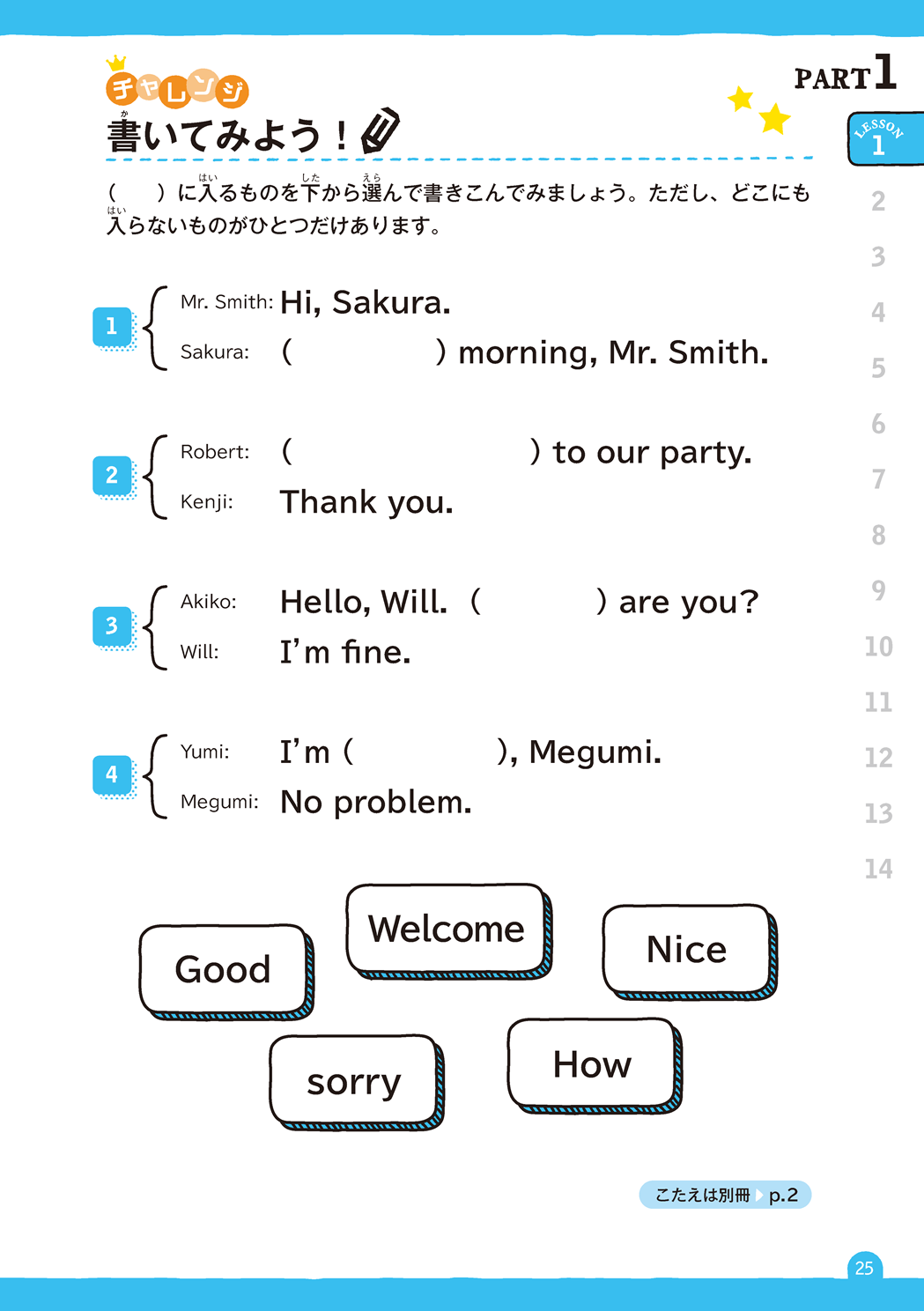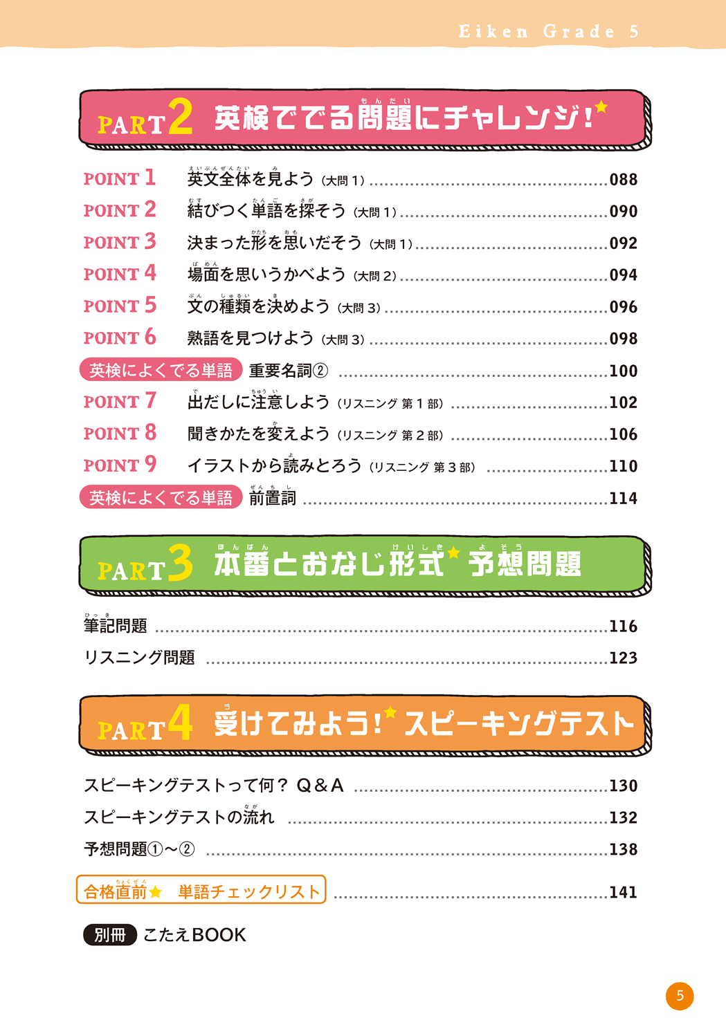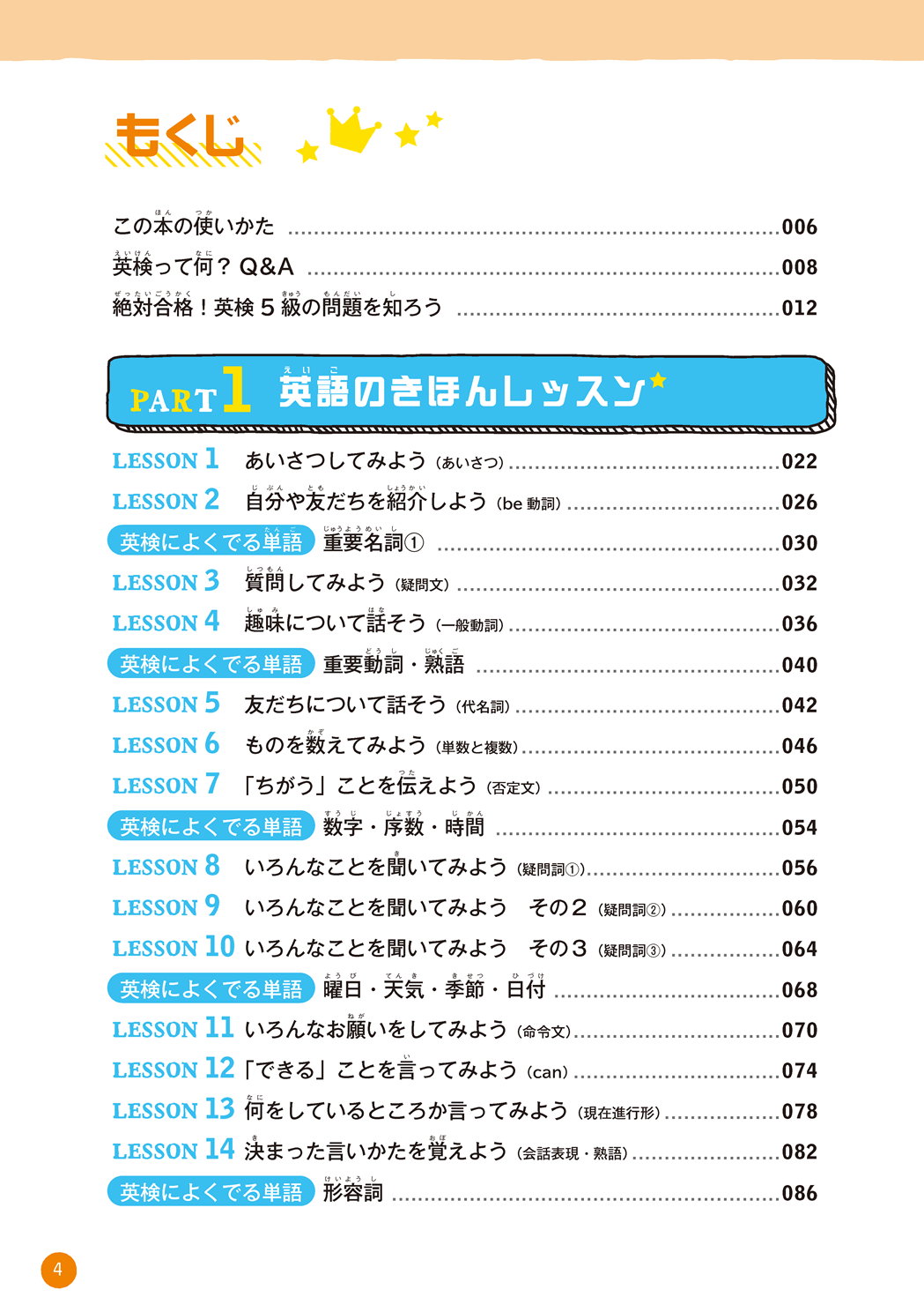 5級の問題を徹底的に分析し、問題の解きかたをわかりやすく説明するのはもちろん、 英語にふれはじめた最初の時期だからこそ大切な英語のきほんもしっかり学べるようになっています。