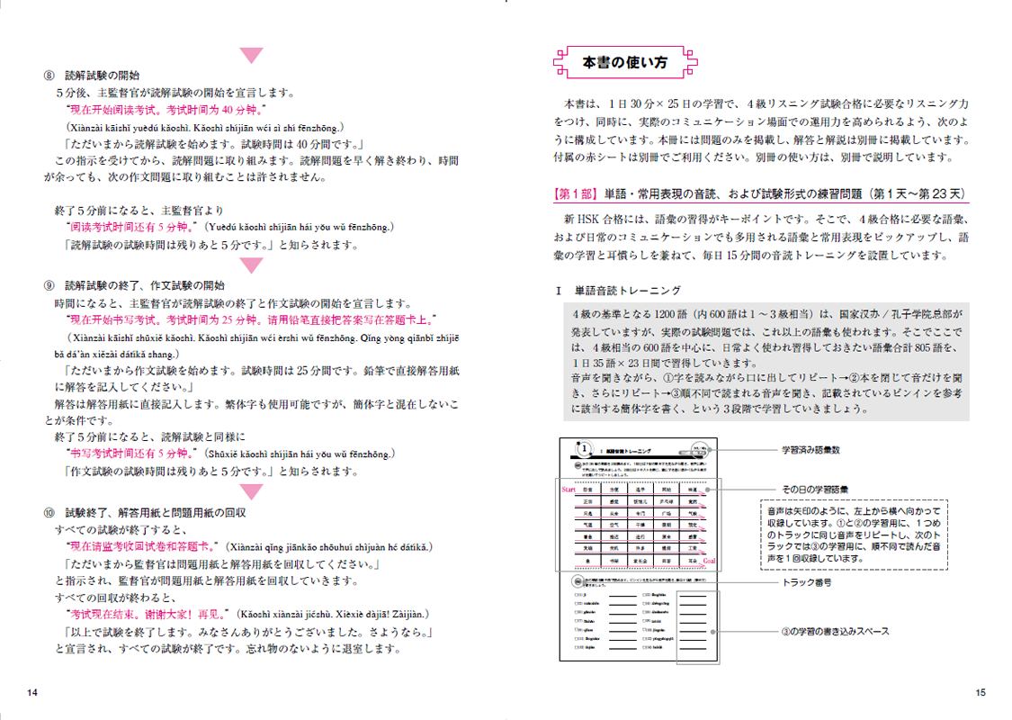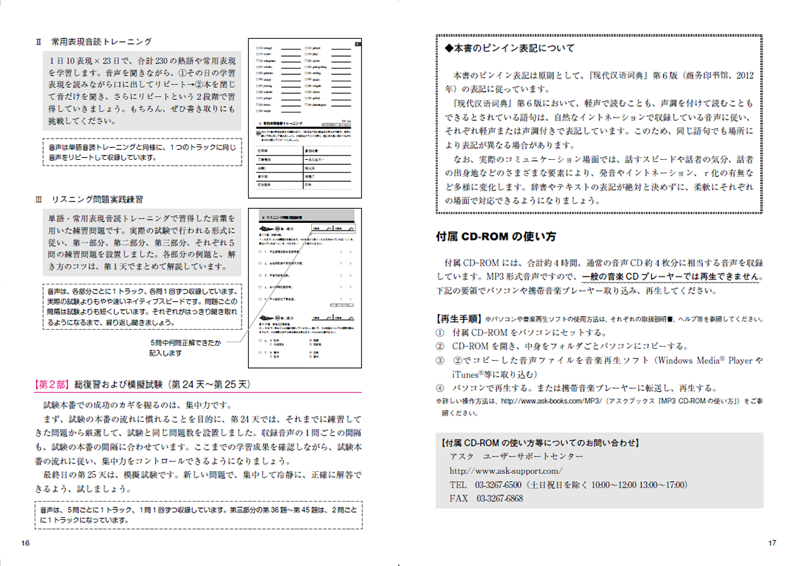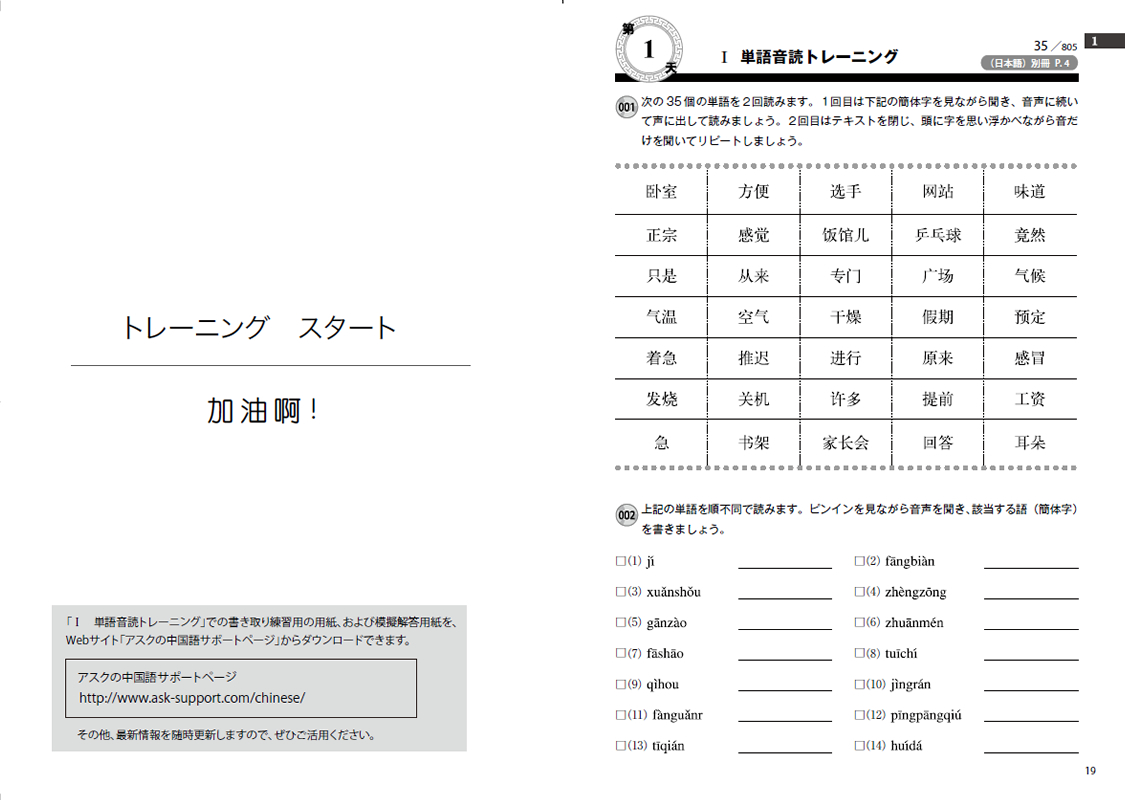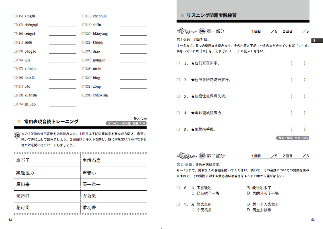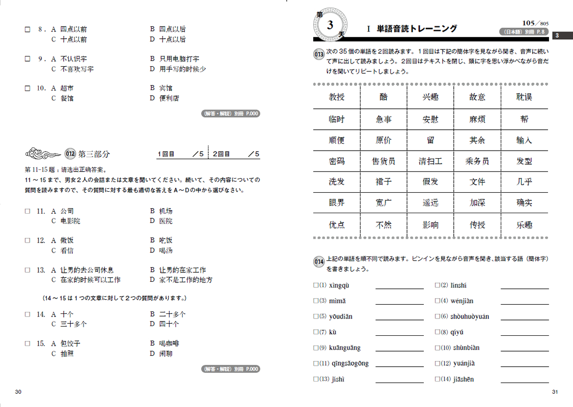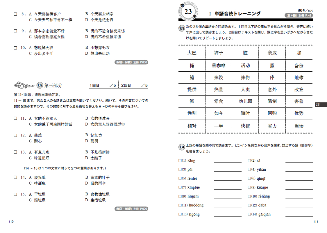 ●練習問題に取り組む前に、単語と常用表現の音読をすることにより、豊富な語彙を習得しながら、中国語の音を聞き分ける耳慣らしを行う。