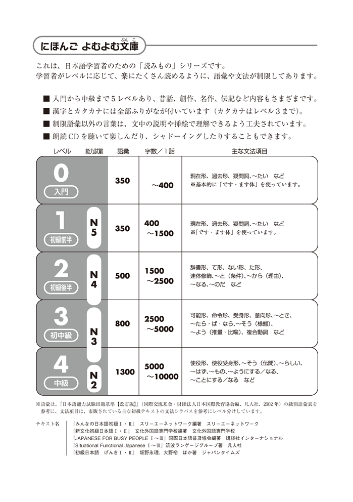 "Nihongo Yomu Yomu Bunko" is a graded reader series designed for learners to enjoy reading Japanese with ease, according to their language level.