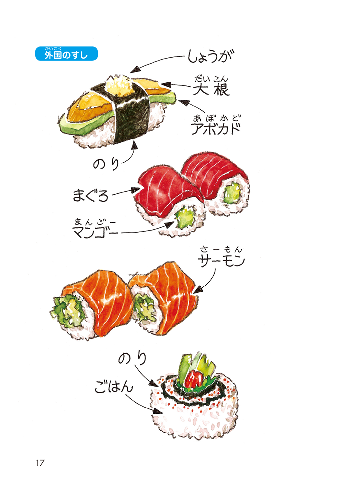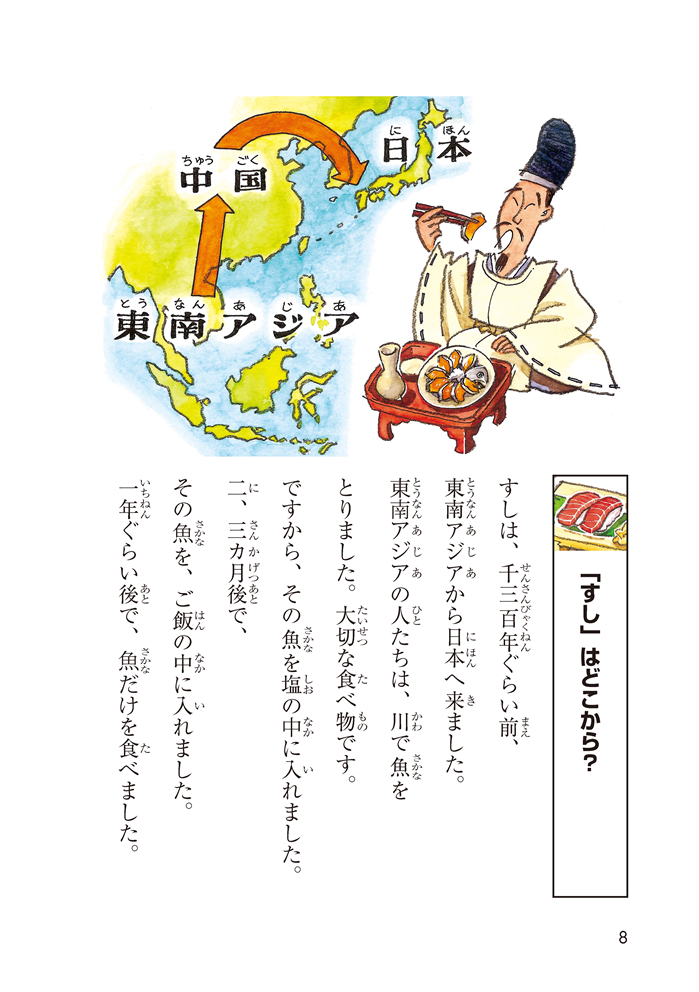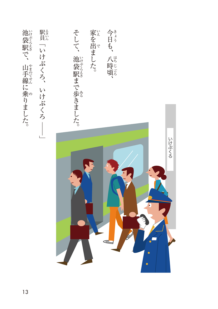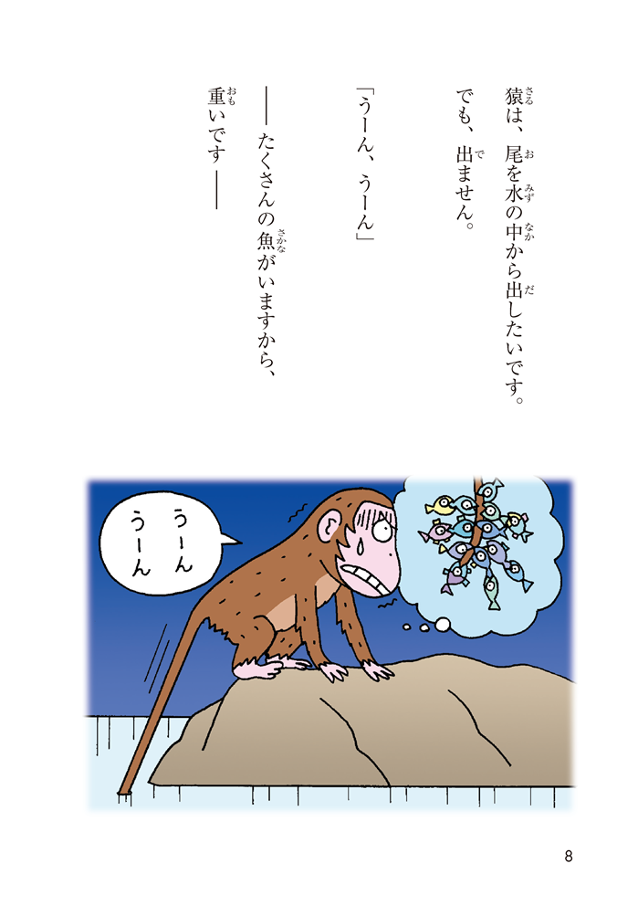漢字はすべてふりがな付き。難しい語彙や表現があっても、イラストや前後の文脈などから意味を想像できるように工夫されています。