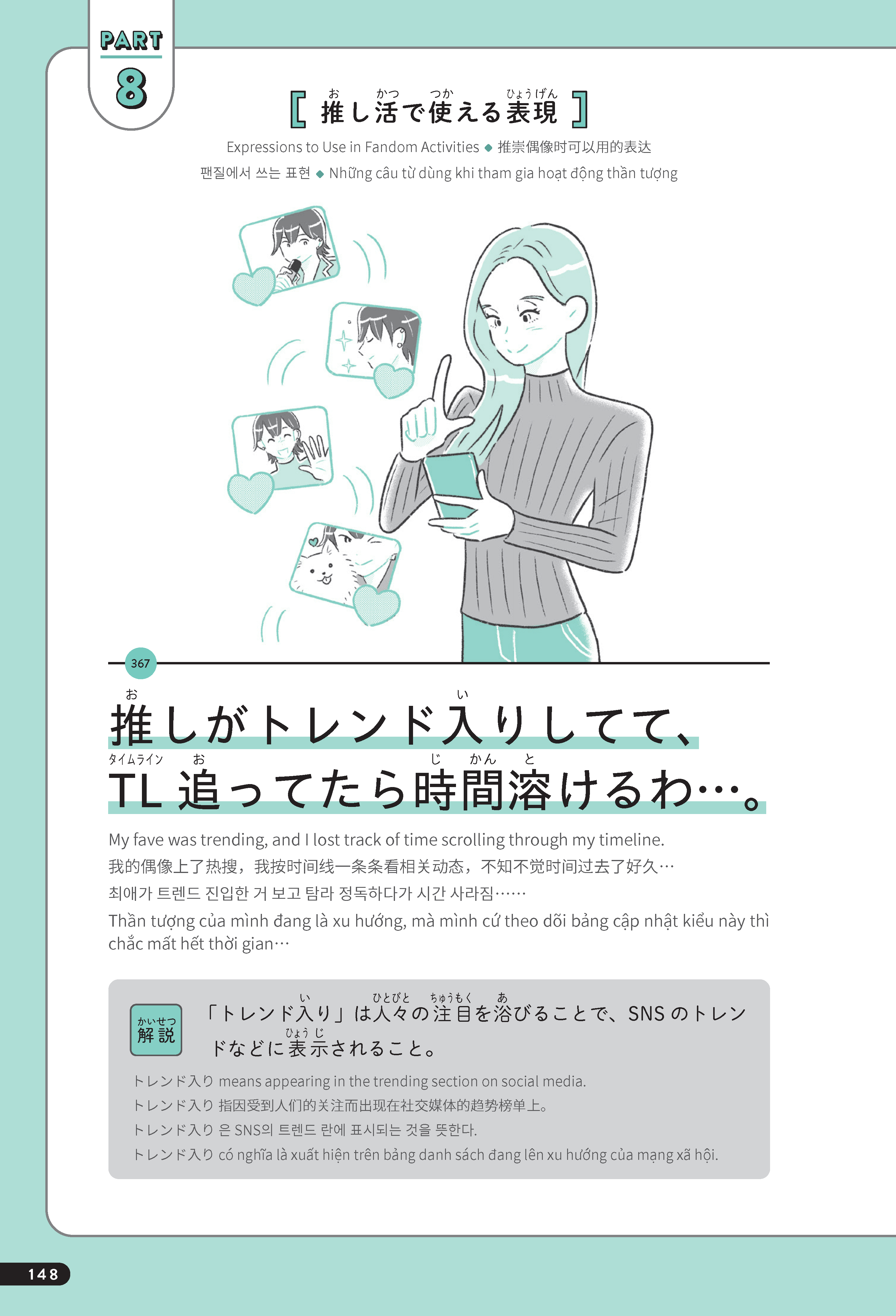 推し活・アニメ・ゲーム・スポーツなど場面別のフレーズに加え、SNSやネットで使える表現も収録しています。