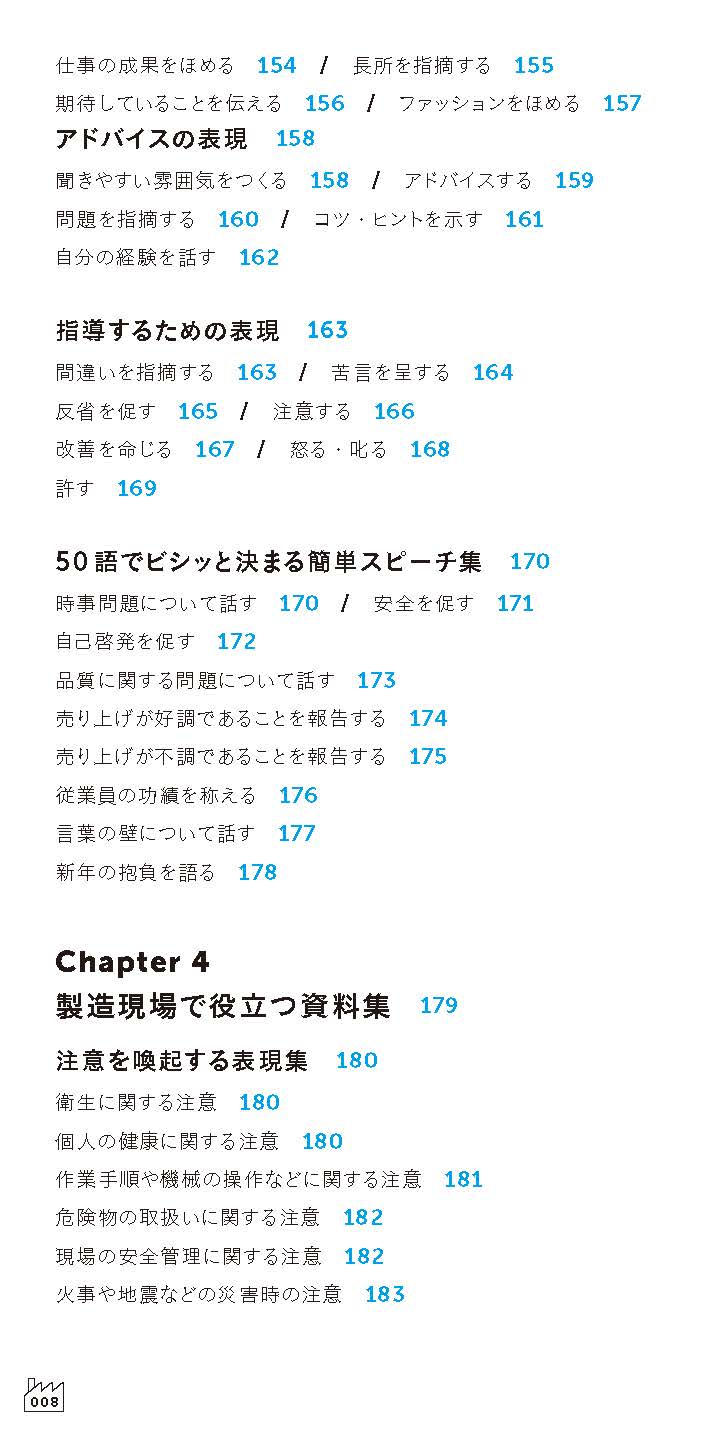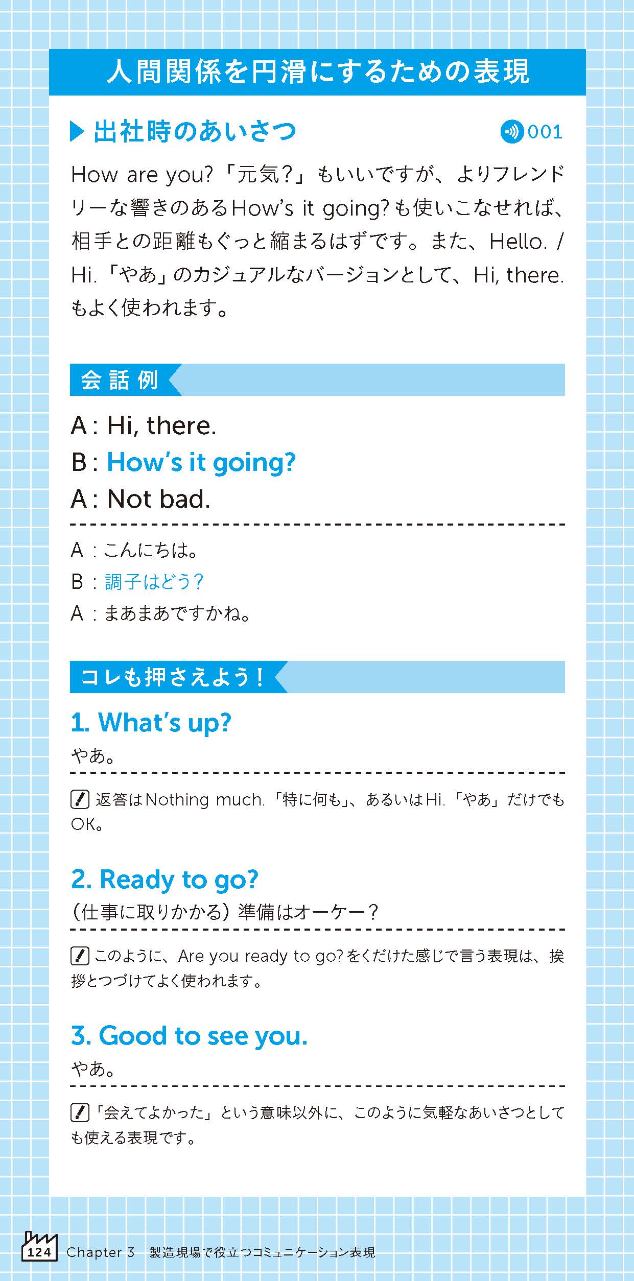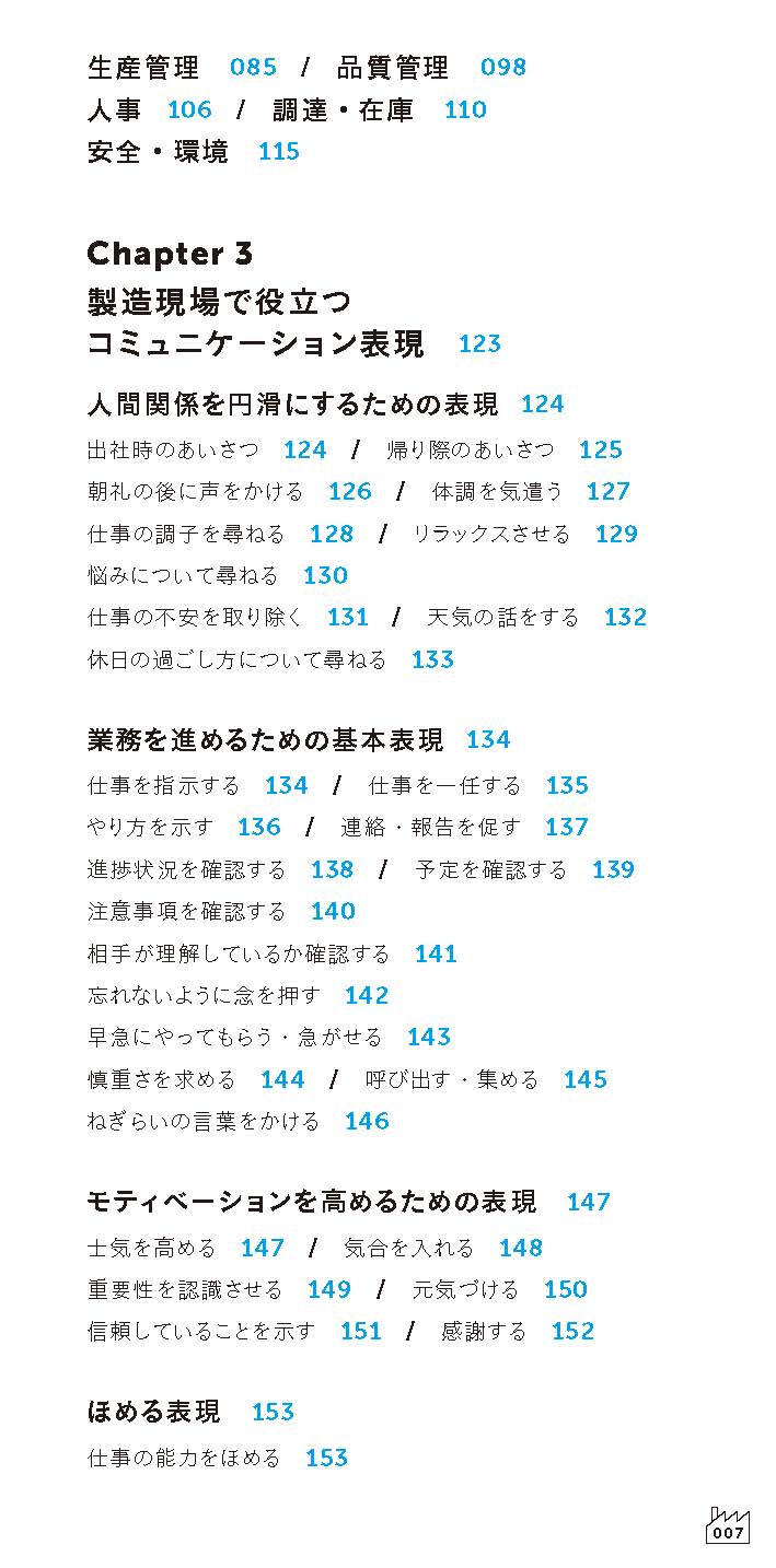 Chapter3には、部下や同僚とのコミュニケーションを取るための「製造現場で役立つコミュニケーション表現」が収録されています。