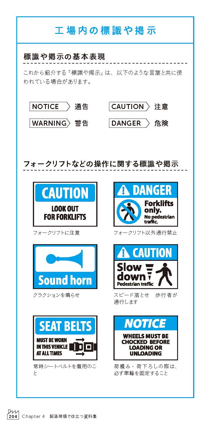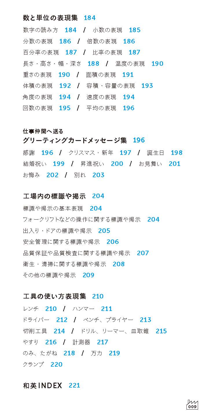 注意を喚起する表現集/数と単位の表現集/仕事仲間に送るグリーティングカード/工場内の標識や掲示/工具の使い方表現集