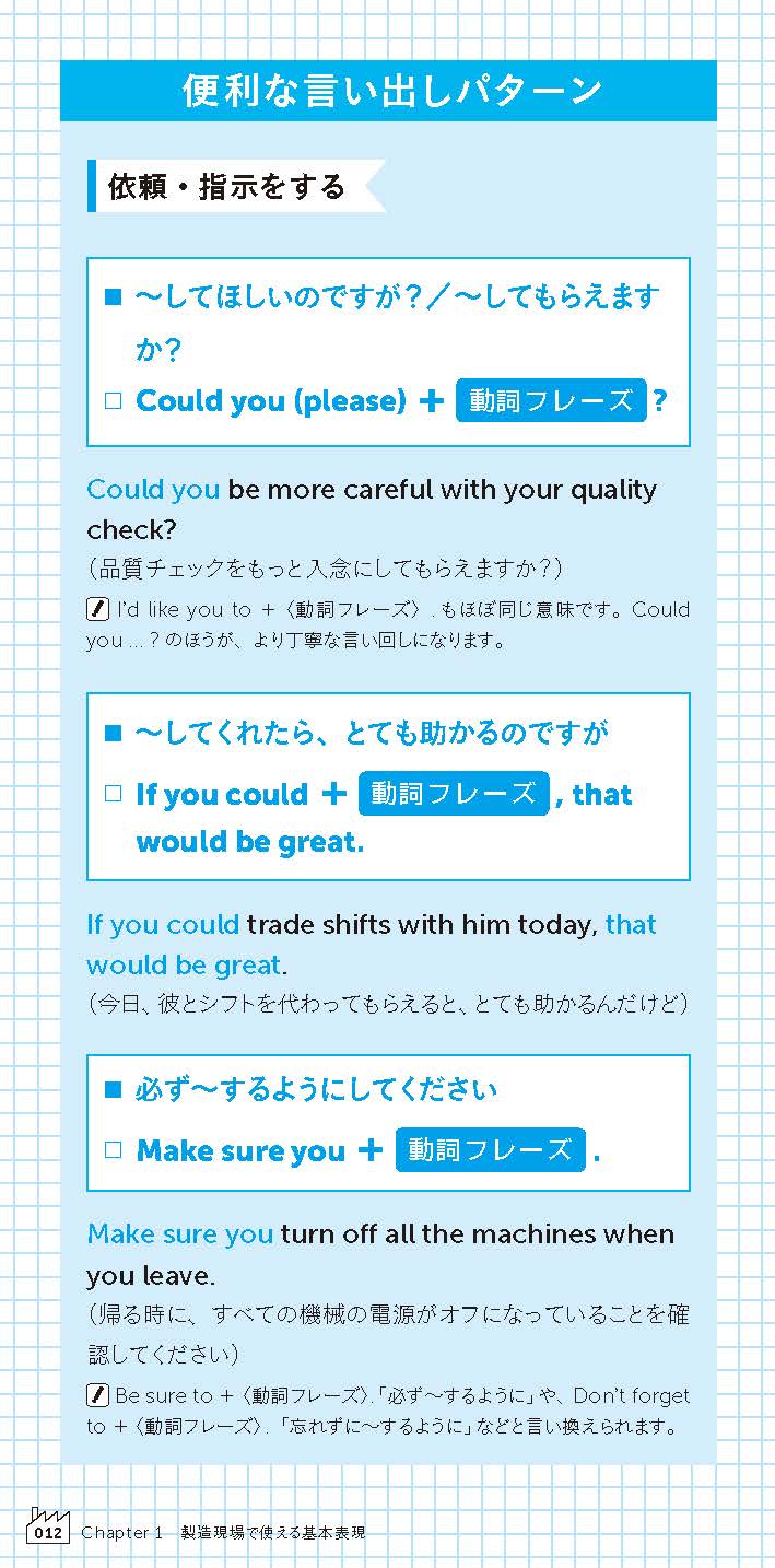 Chapter1で紹介されている「言い出しパターン」にChapter2の「製造現場で使われる英語表現」を組み合わせるだけで、実践的なセンテンスを作ることができます。
