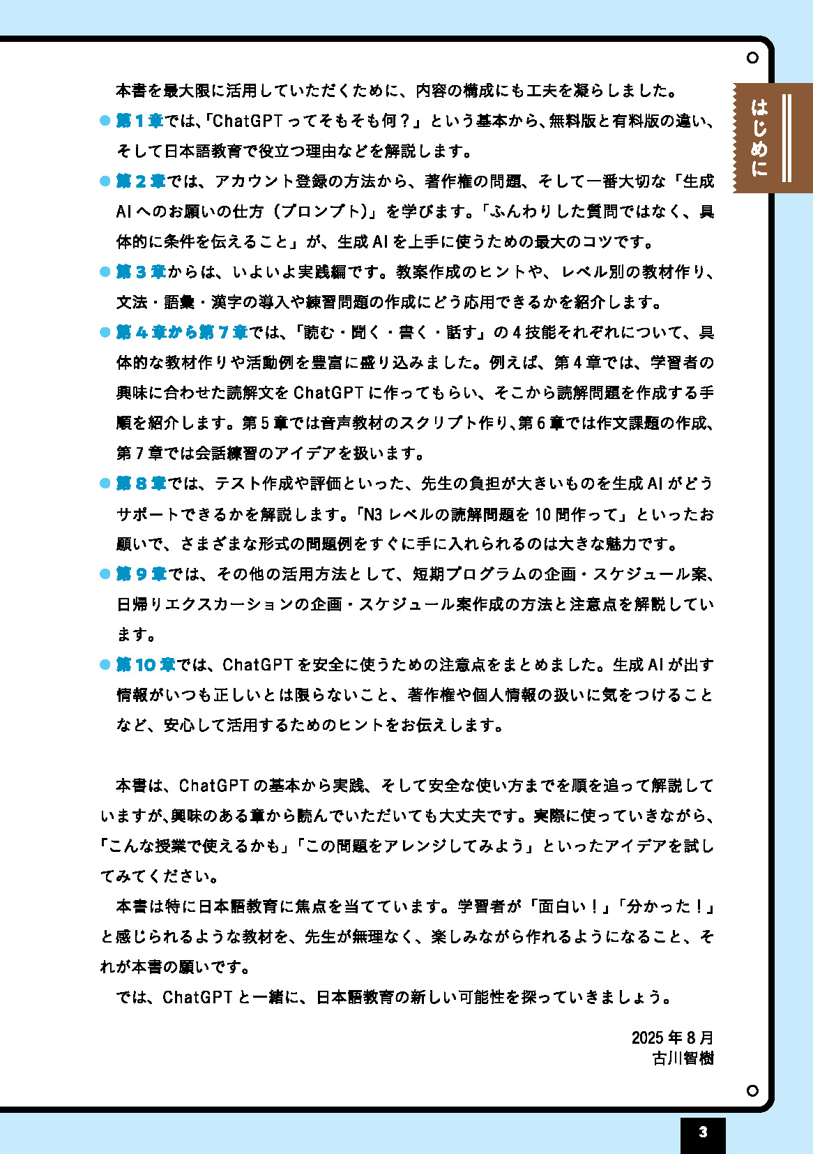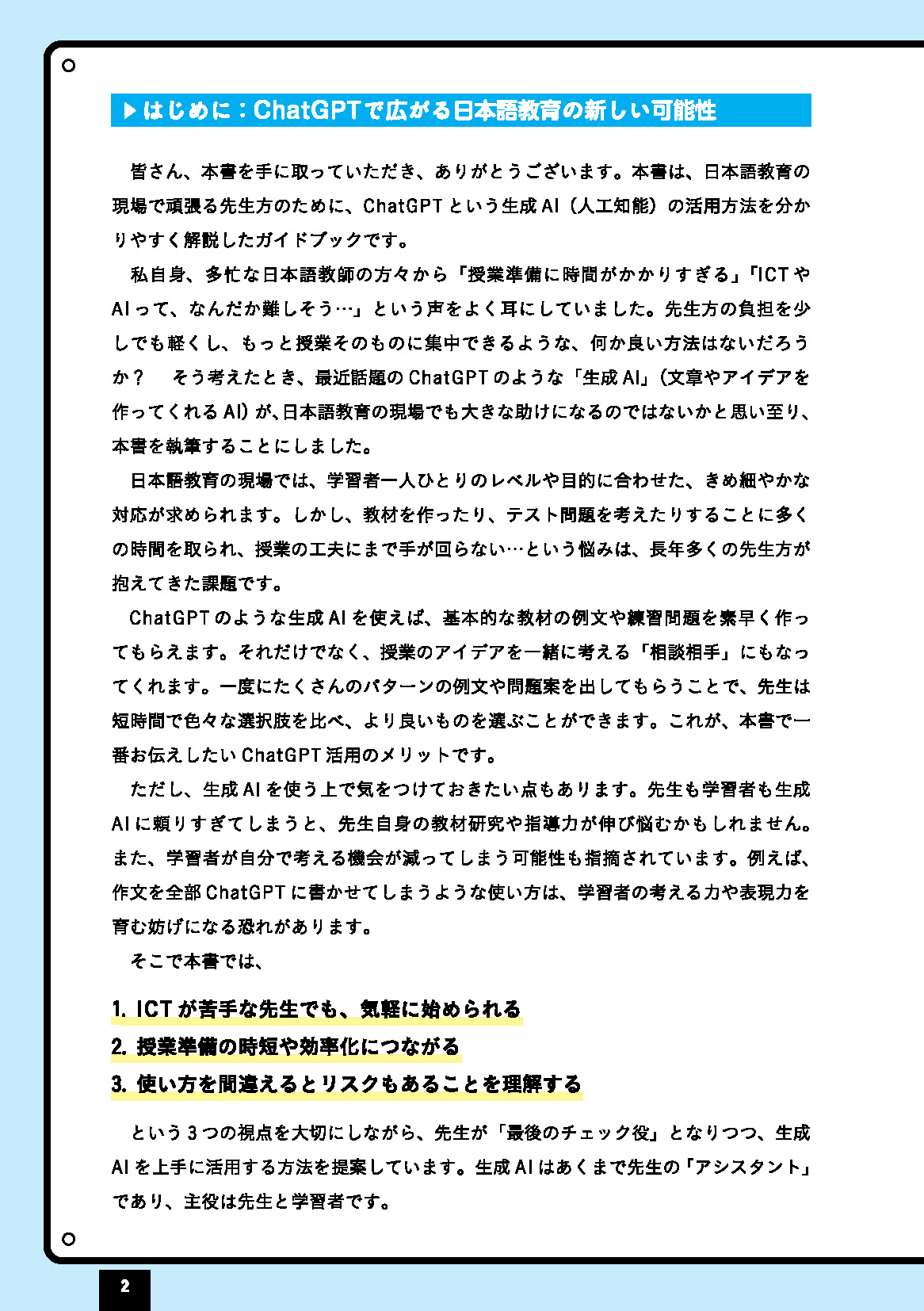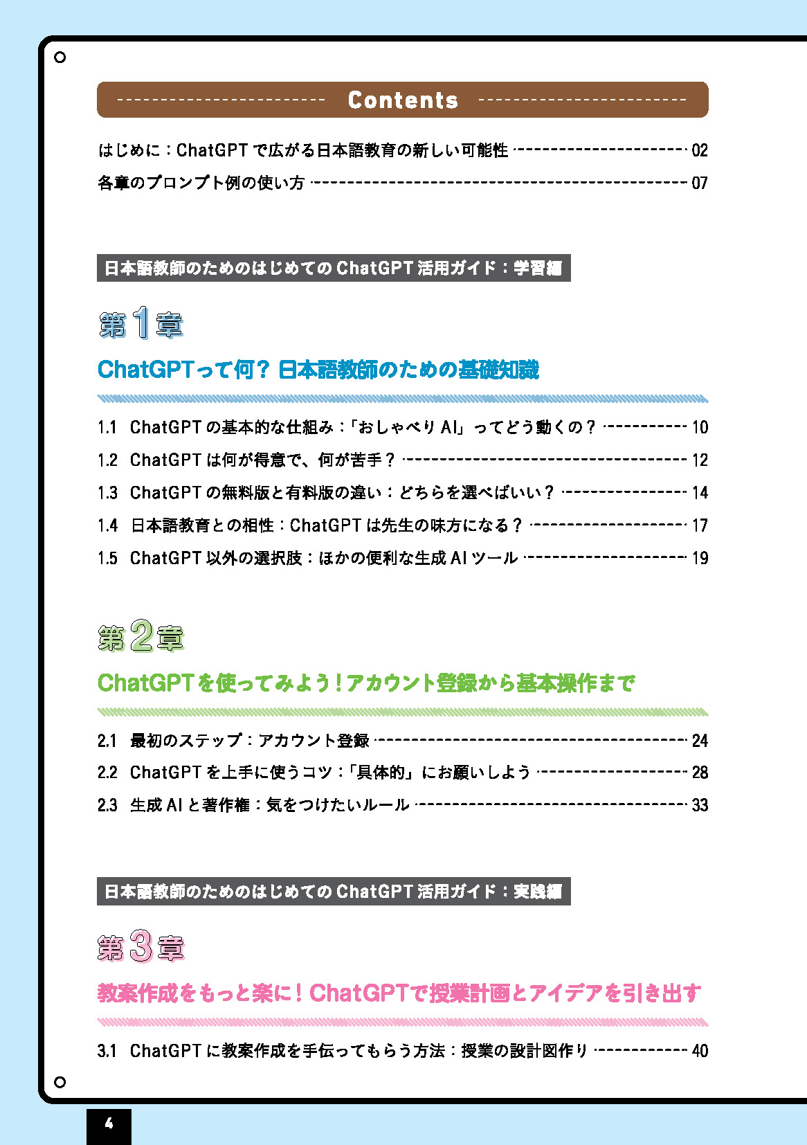 「ChatGPTって何?」から始まり、ChatGPTの基本的な使い方から教育現場での活用法まで、わかりやすくていねいに解説してあるので、「デジタルは苦手…」という人でも、その日からすぐに使い始めることができます。