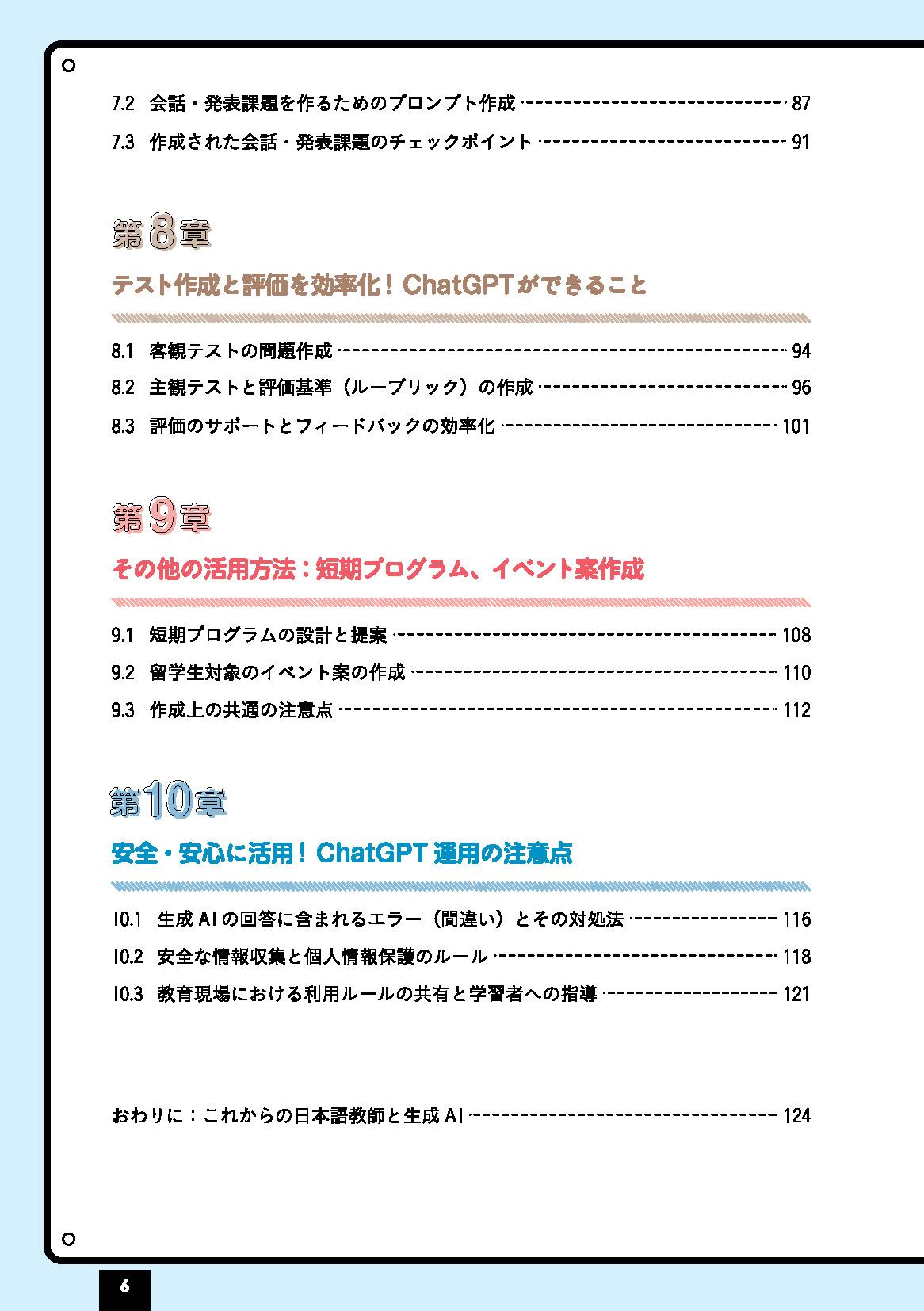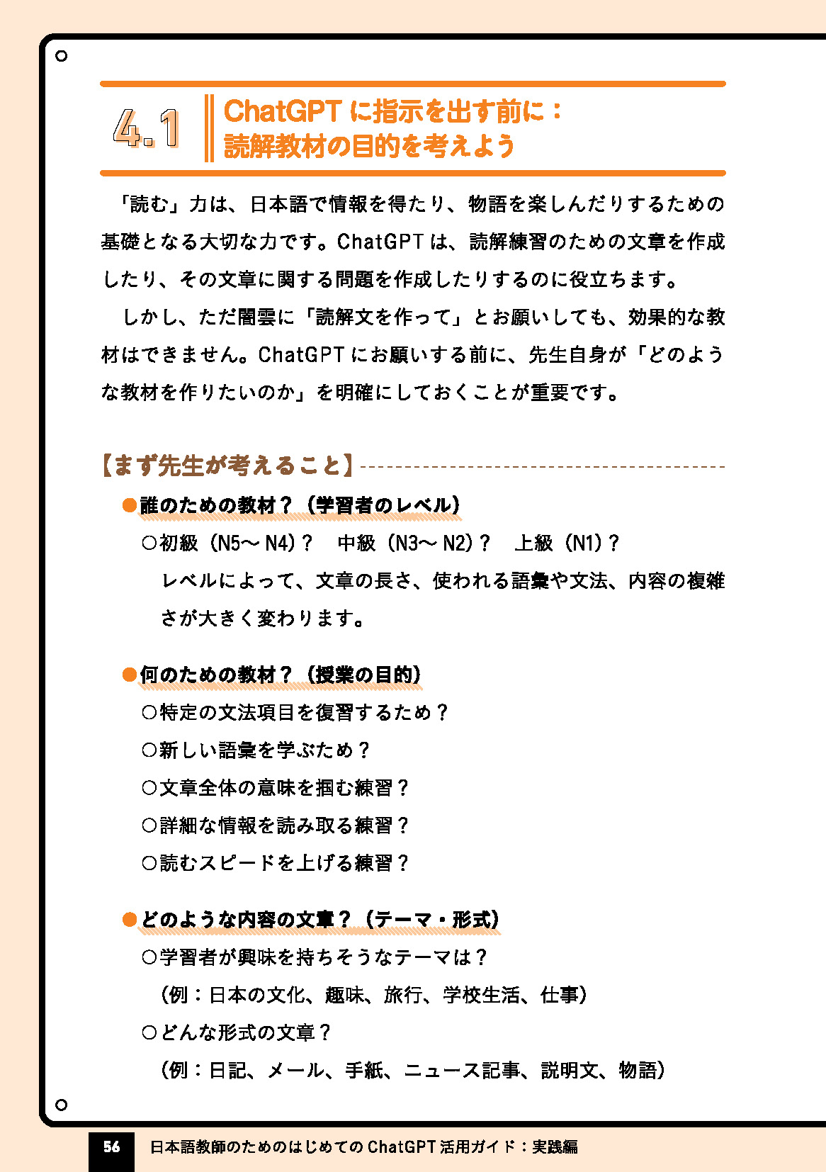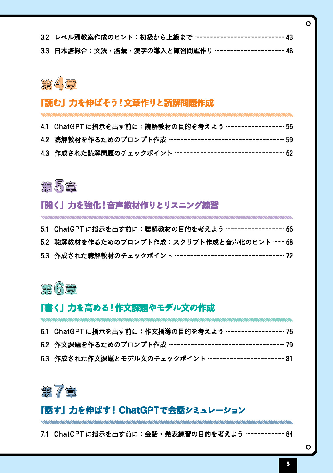 教案作成や「読む・聞く・話す・書く」の練習、テスト作成、評価など、実際の授業でどのようにChatGPTを効果的に使えるか、具体的な例を紹介しています。
