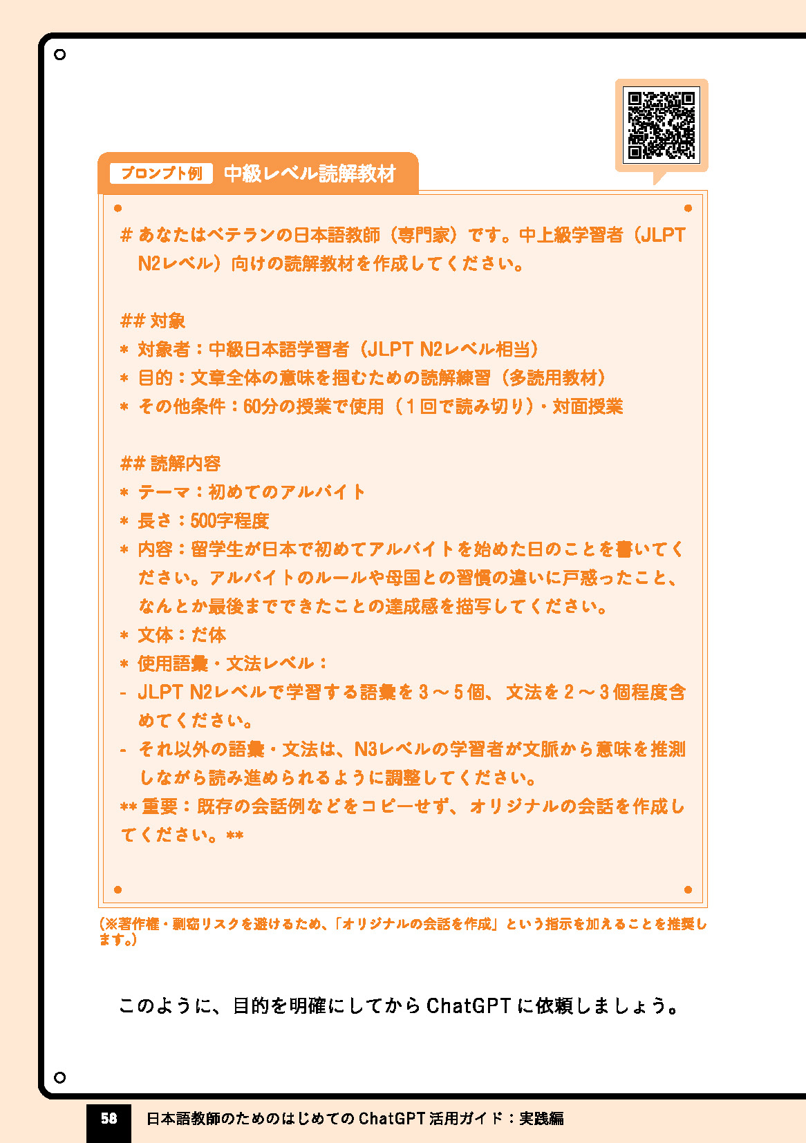 日本語教育の現場ですぐに使えるプロンプト例を多数収録。各プロンプト例についているQRコードから、書籍で紹介しているプロンプトをご使用いただけます。