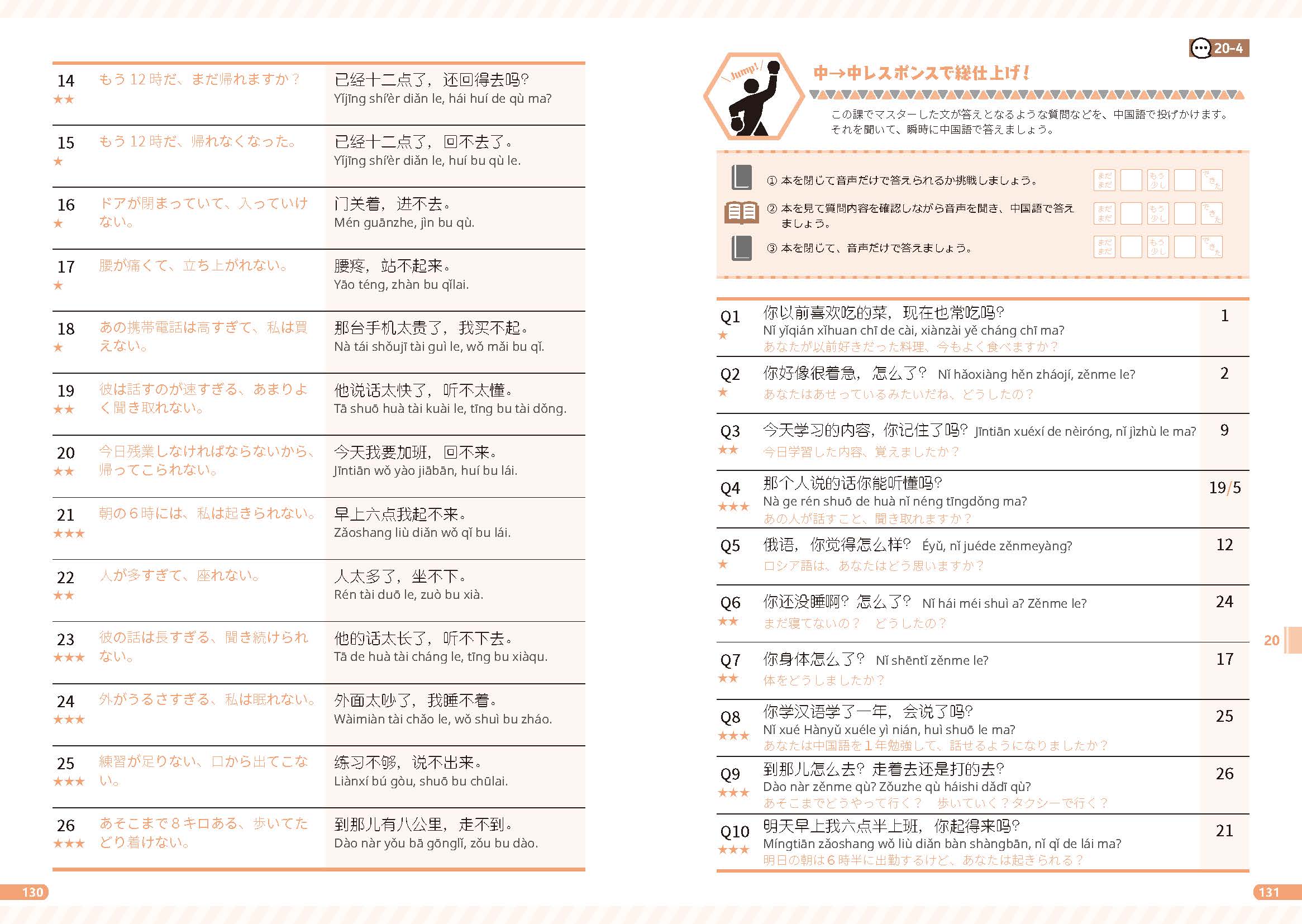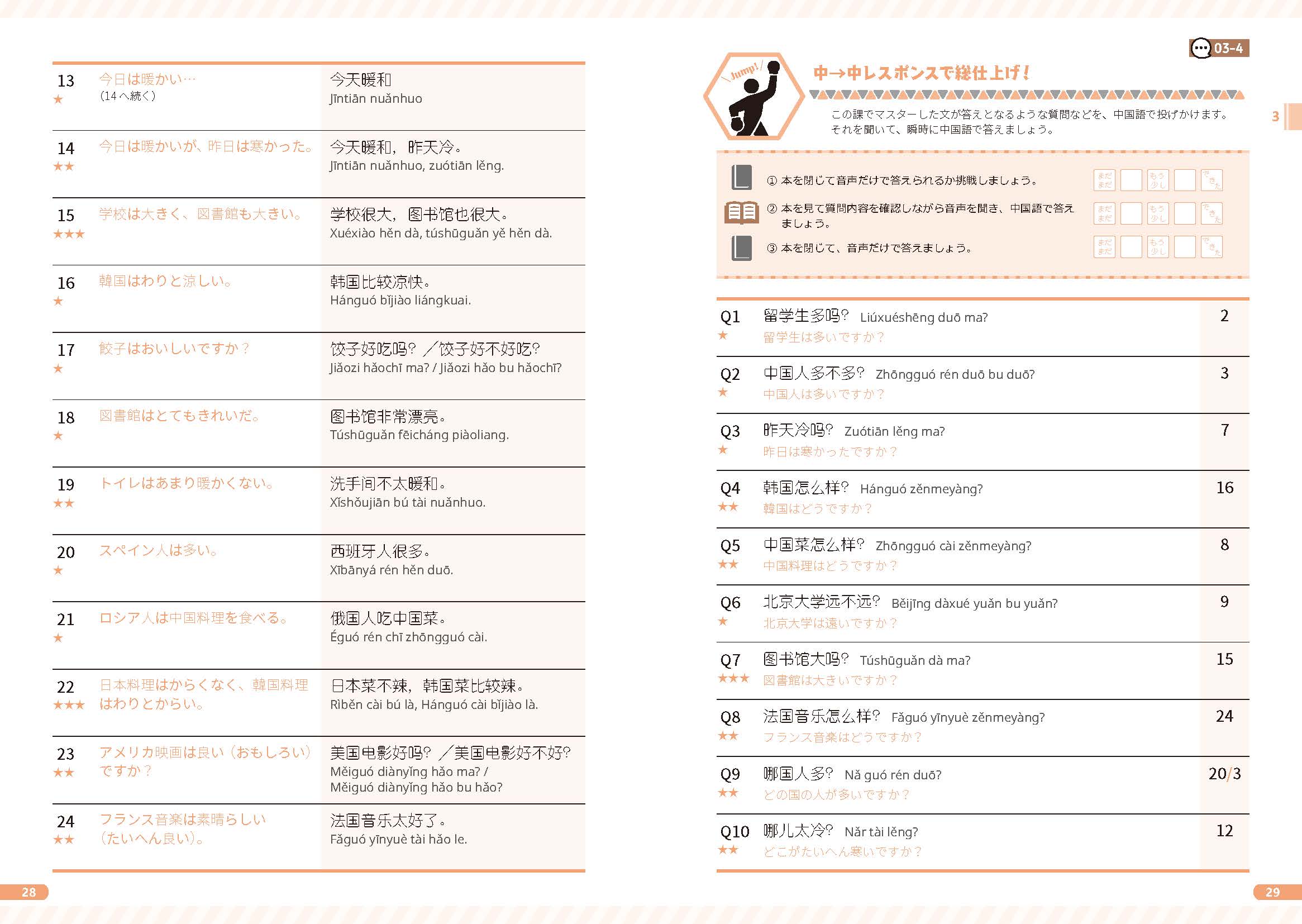その課の練習で使う単語やフレーズの日本語訳を聞き、中国語で答えます。