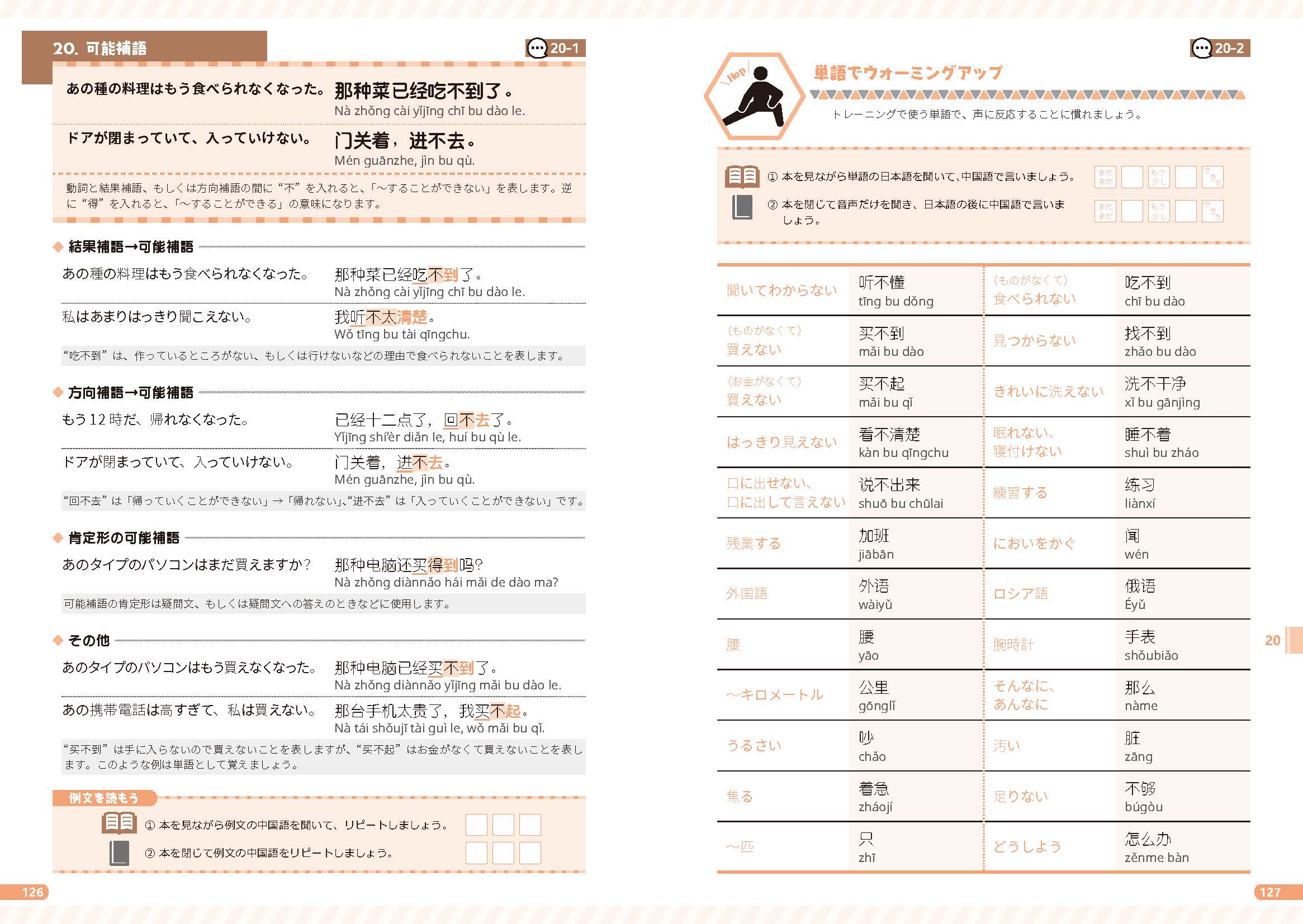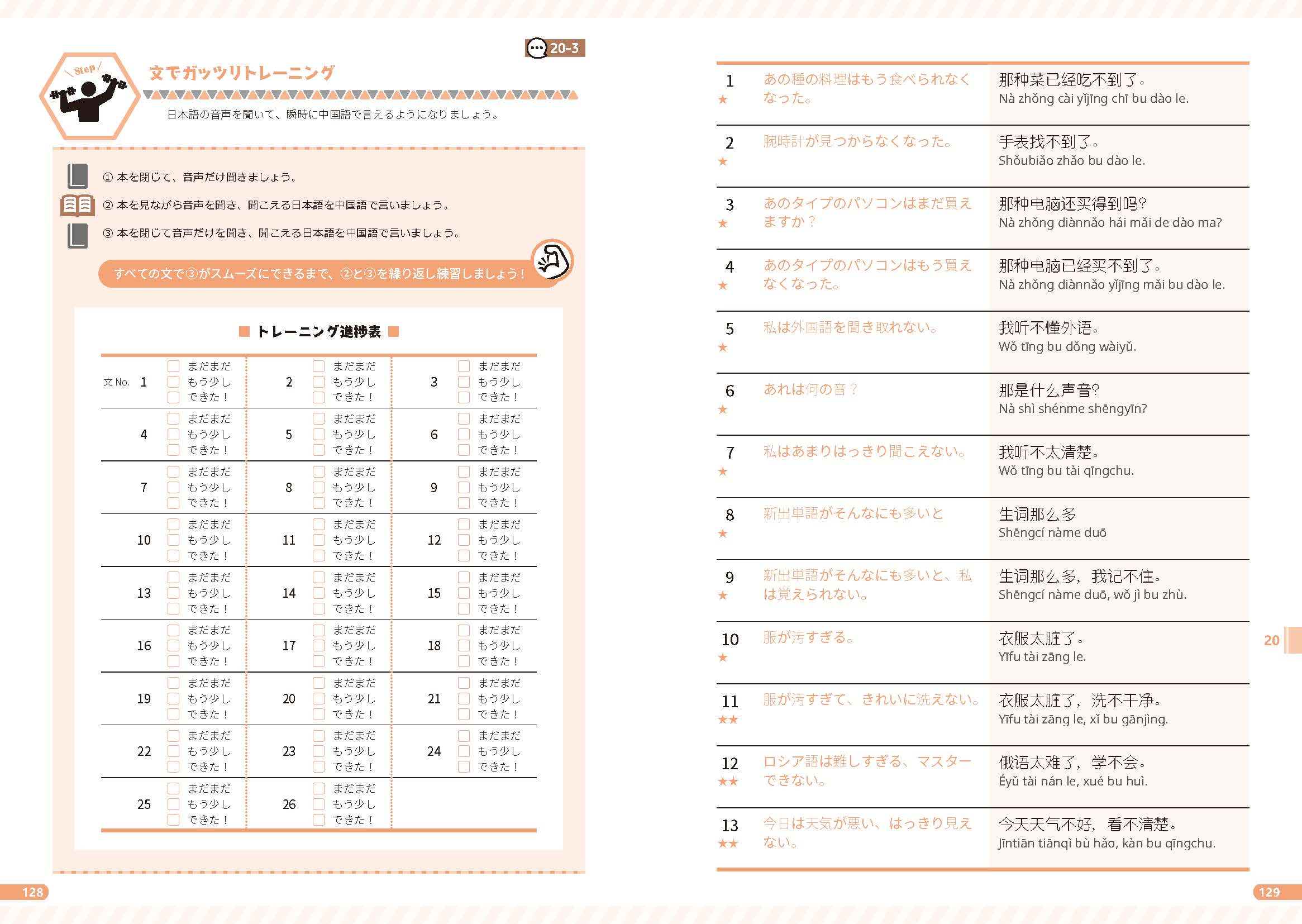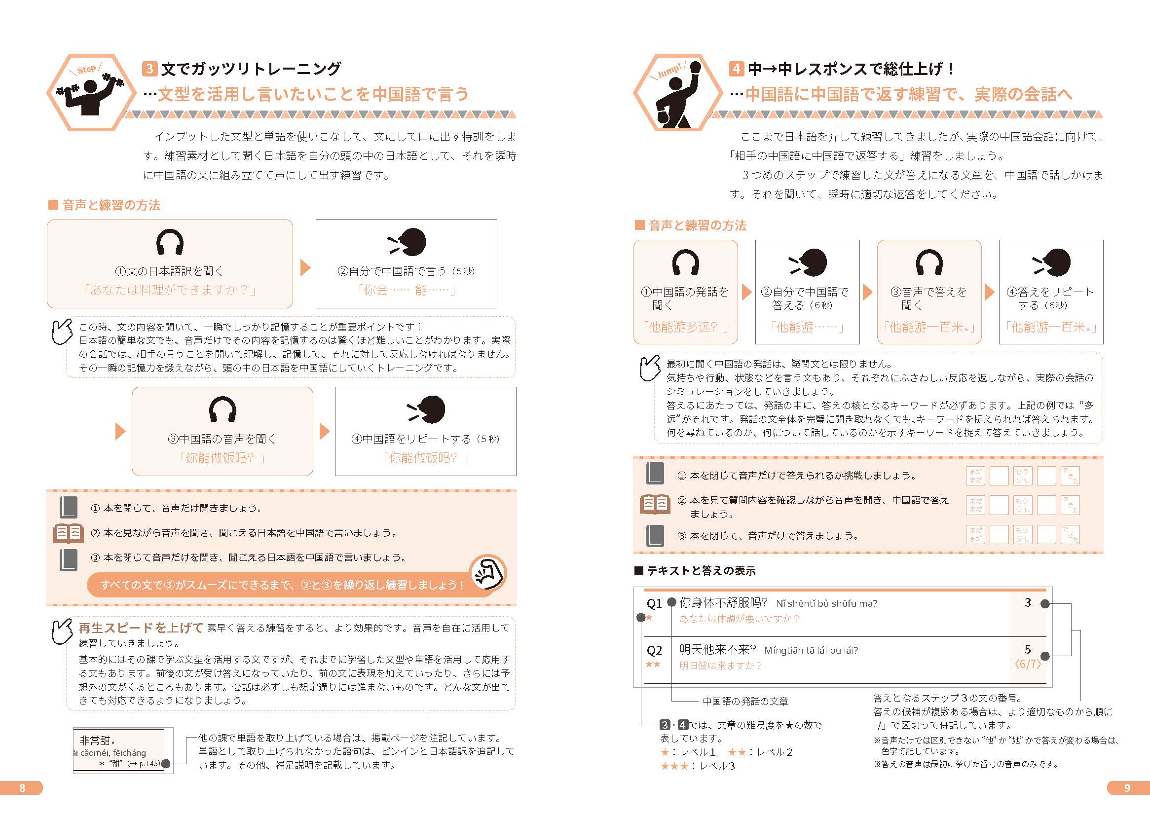①単語や文の音声(2・3は日本語、4は中国語)を聞く→②自分の口で中国語で言う→③音声で中国語を聞く→④中国語をリピートする