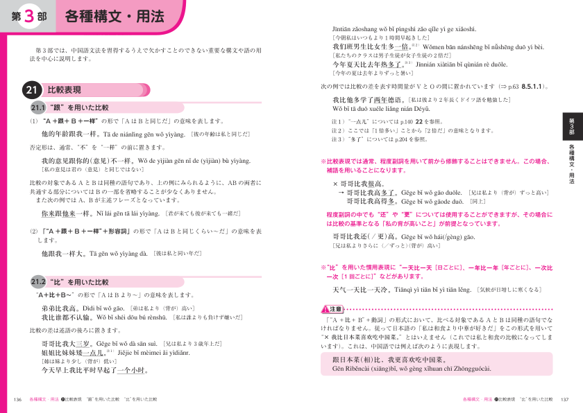 メーンとなる解説部分の記述を補足・補強するものとして、[参考][比較]および[中国語らしい表現]ほか、様々な角度から理解を深める試みが施してあります(各記号の意味については、p.10を参照)。