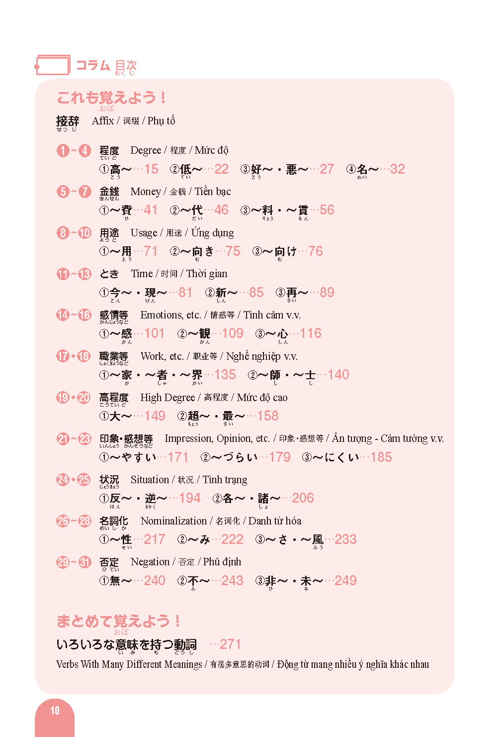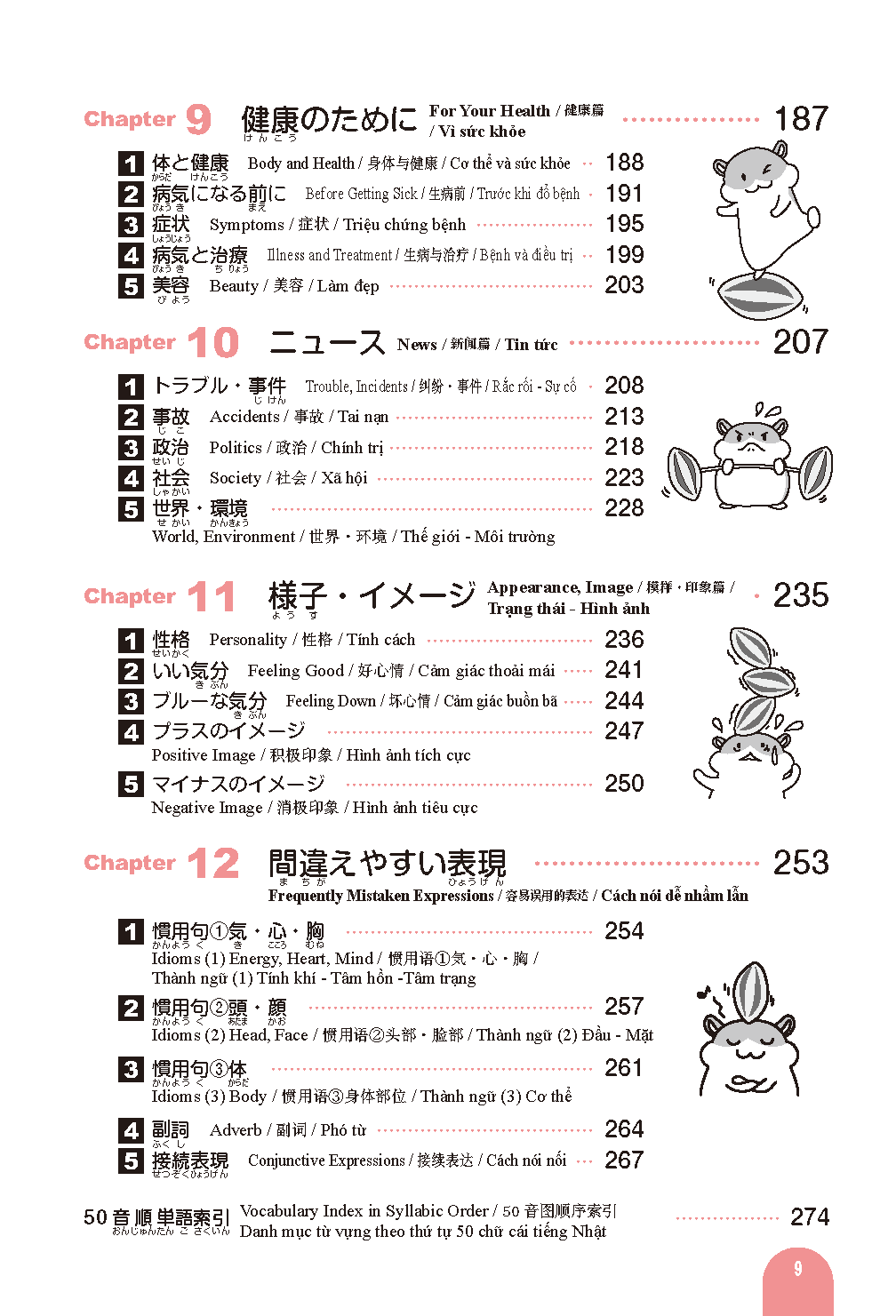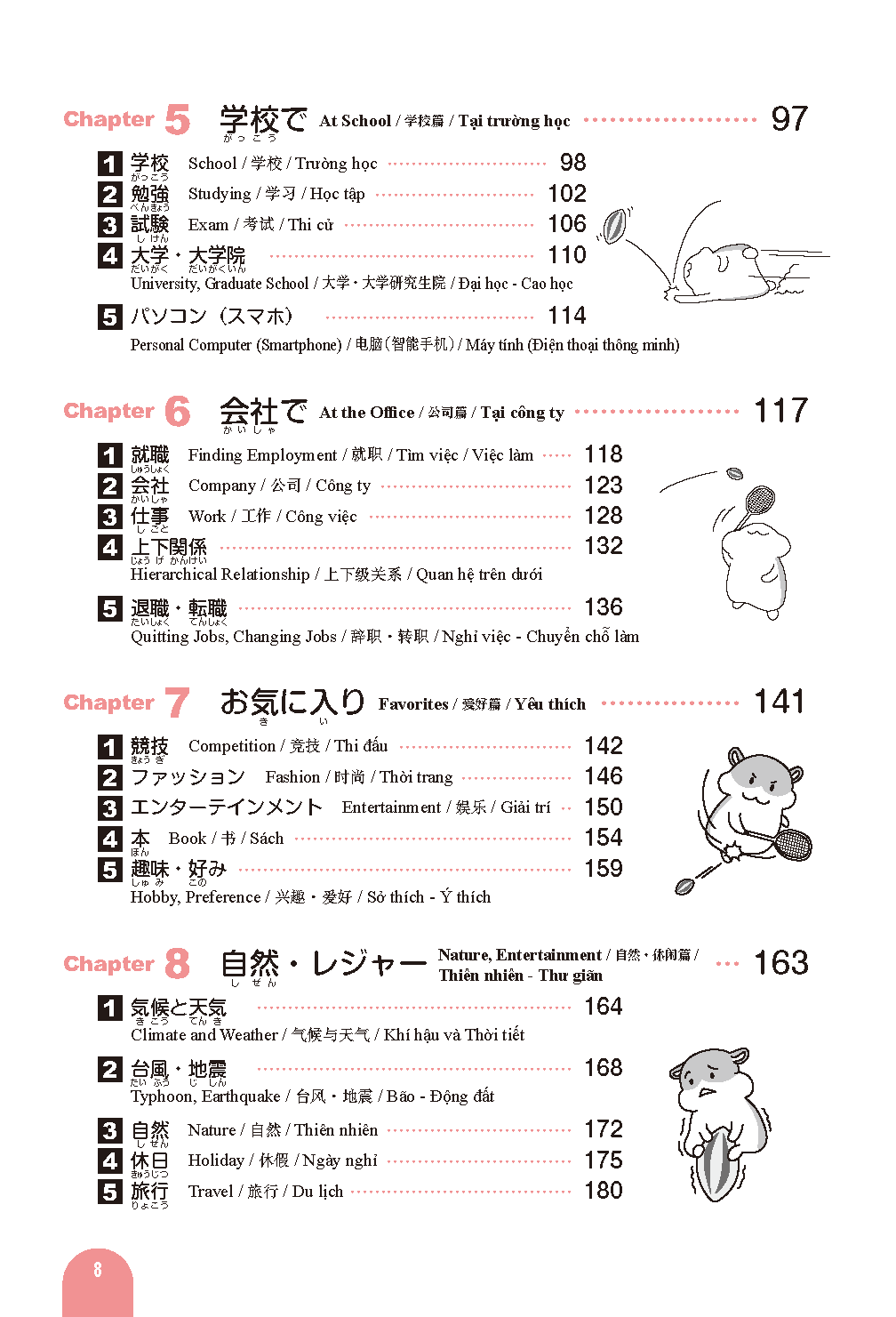 Vocabulary words often used on the Japanese Language Proficiency Test are divided into various themes organized into chapters and sections for ease of study.