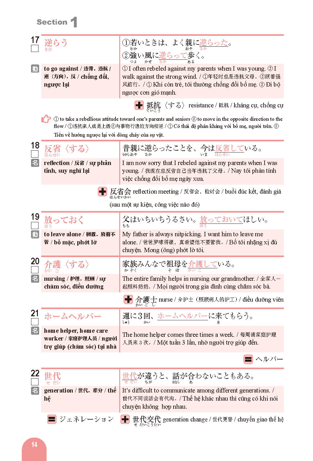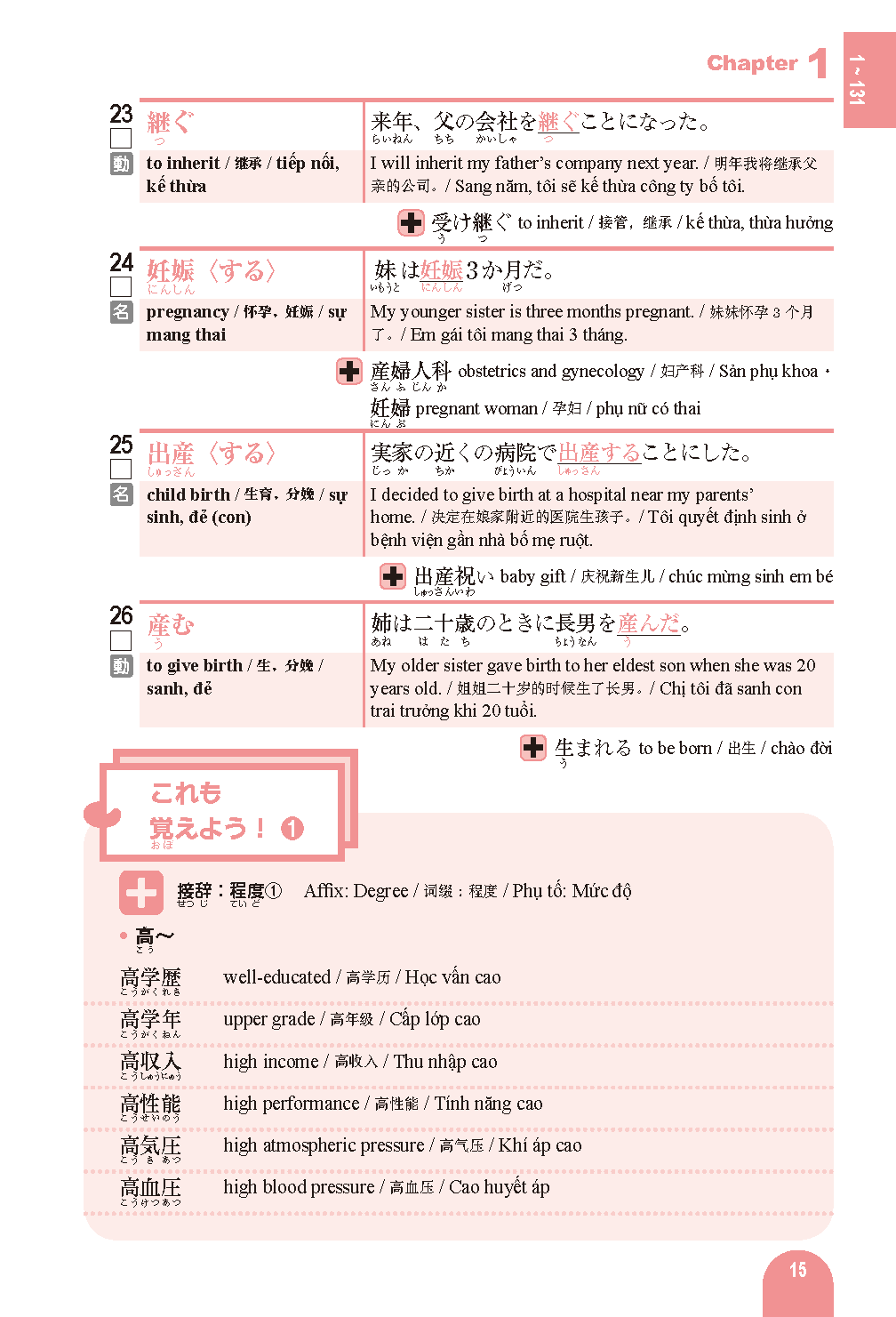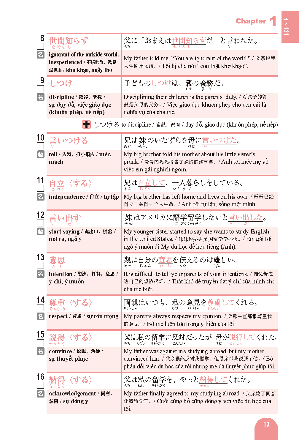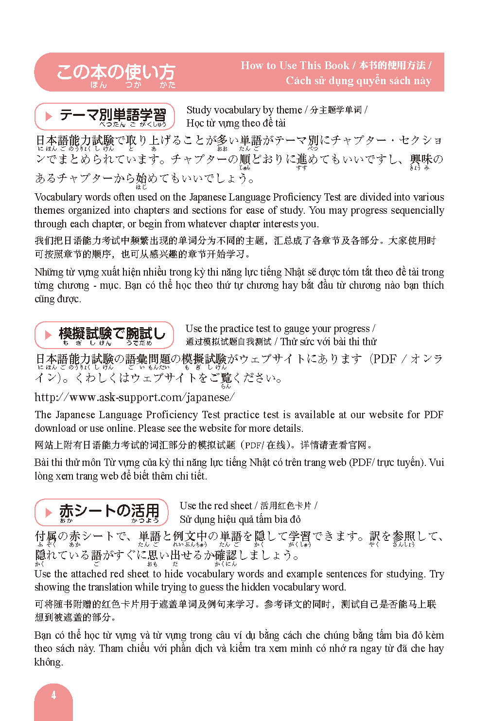 Vocabulary words often used on the Japanese Language Proficiency Test are divided into various themes organized into chapters and sections for ease of study.