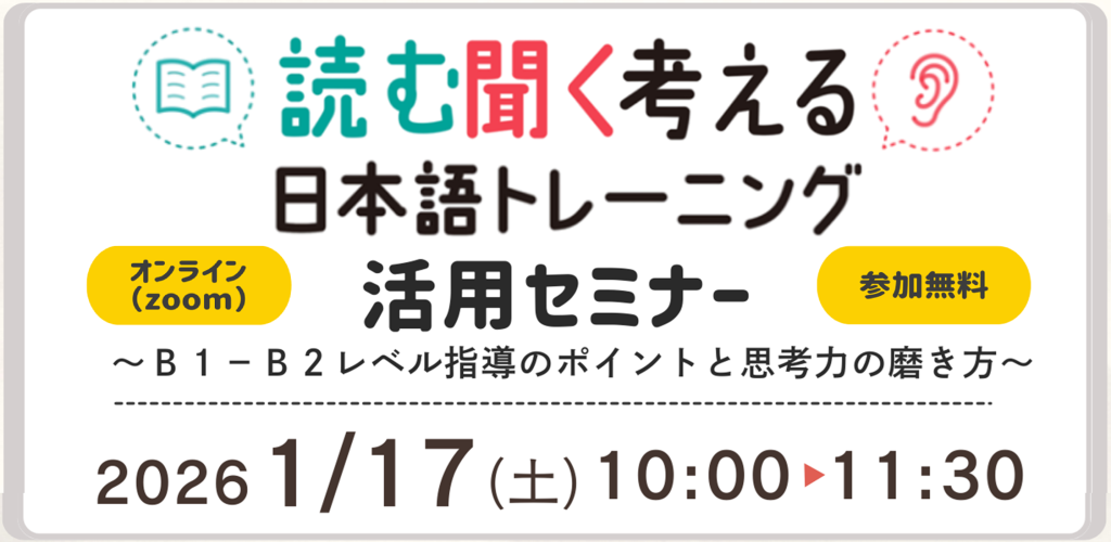 ホーム 会社情報 ニュース 1/17『読む聞く考える日本語トレーニング』活用セミナー 1/17『読む聞く考える日本語トレーニング』活用セミナー 2025.12.26 イベント お申込みはこちら! 締切:2026/1/15(木)15:00定員300名(定員に達し次第締め切らせていただきます。) 書籍の情報はこちら ニュース一覧へ戻る 会社情報 会社概要 会社沿革 事業紹介 ニュース