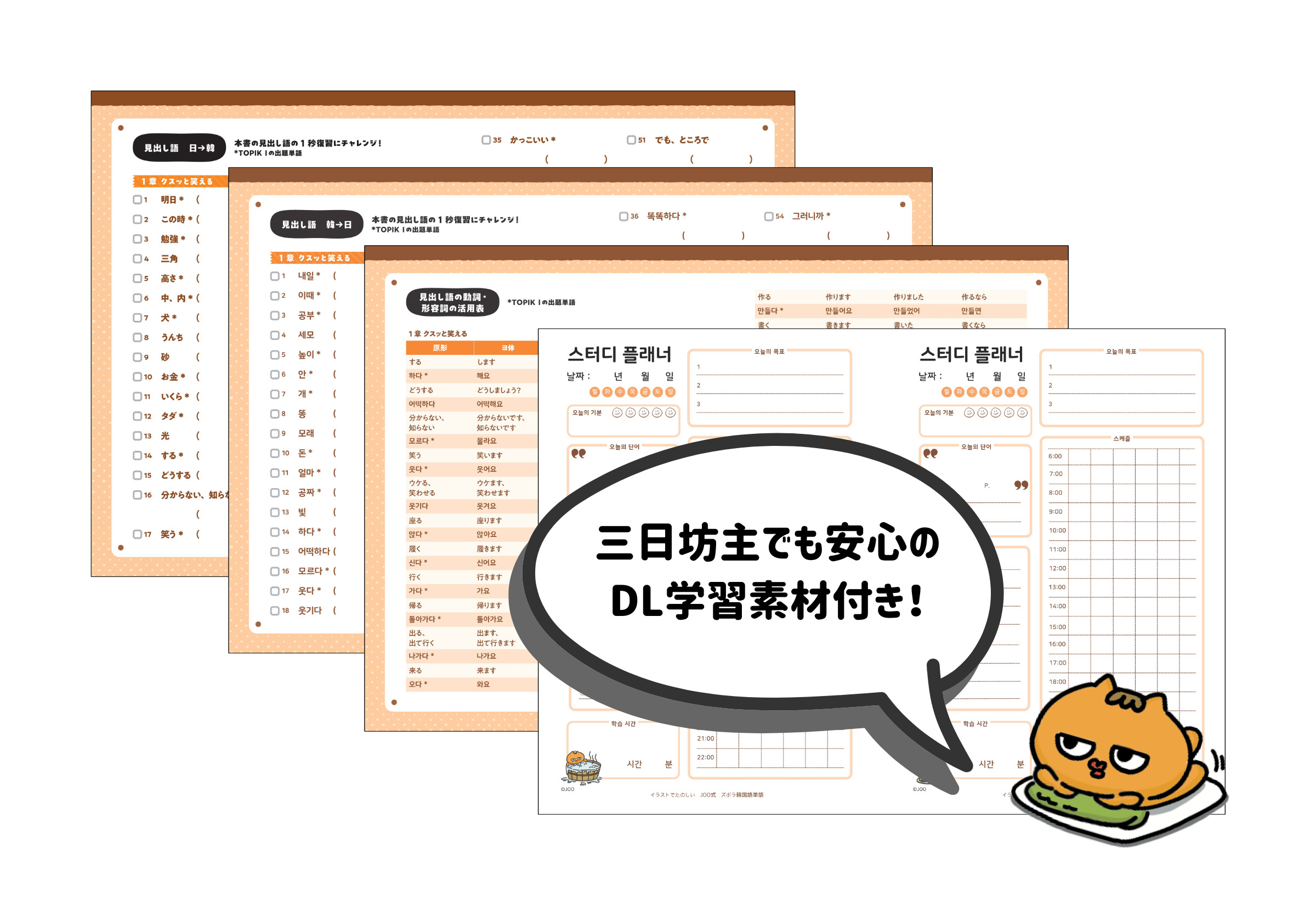 「ズボラネコ」と仲間たちの日常を切り取った癒しイラストと一緒に学べるから、モチベーションが続きます。