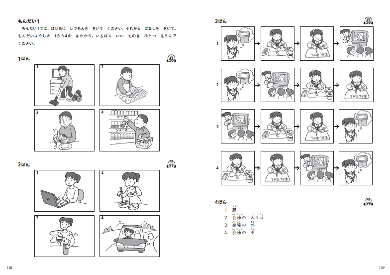 N1~N5は、ポスター / メール / エッセイ / 会話文 / 新聞記事 / 実用書 / スピーチ / 論文 など。STARTはひらがな・カタカナから始まり、シンプルで実用的な会話をテーマとして学習していきます。